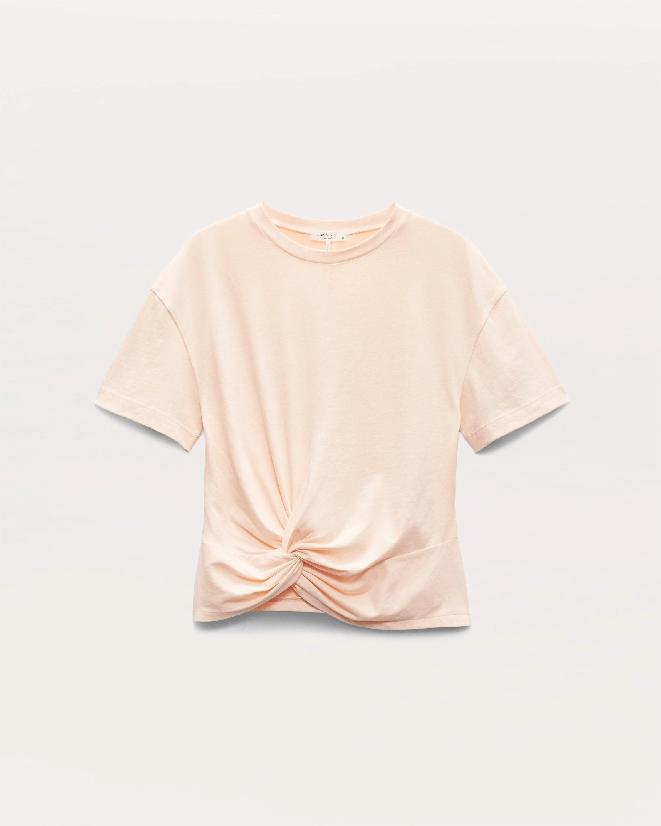 Cut with the perfect drape from super-soft Peruvian cotton, this short-sleeve T-shirt is finished with a feminine twist detail at the front for a fresh take on a classic tee. Size & Fit Relaxed fit draped tee Size Small: Back length 24 1/4", chest 34", sweep 29 1/2", sleeve length 6 1/4" Model is 5'10" wearing size small Features & Details 100% Cotton Machine wash cold, gentle cycle, do not bleach, tumble dry low, low iron if needed or dry clean Draping detail at front hem Made in Peru Product ID: WCC25ST015MC17