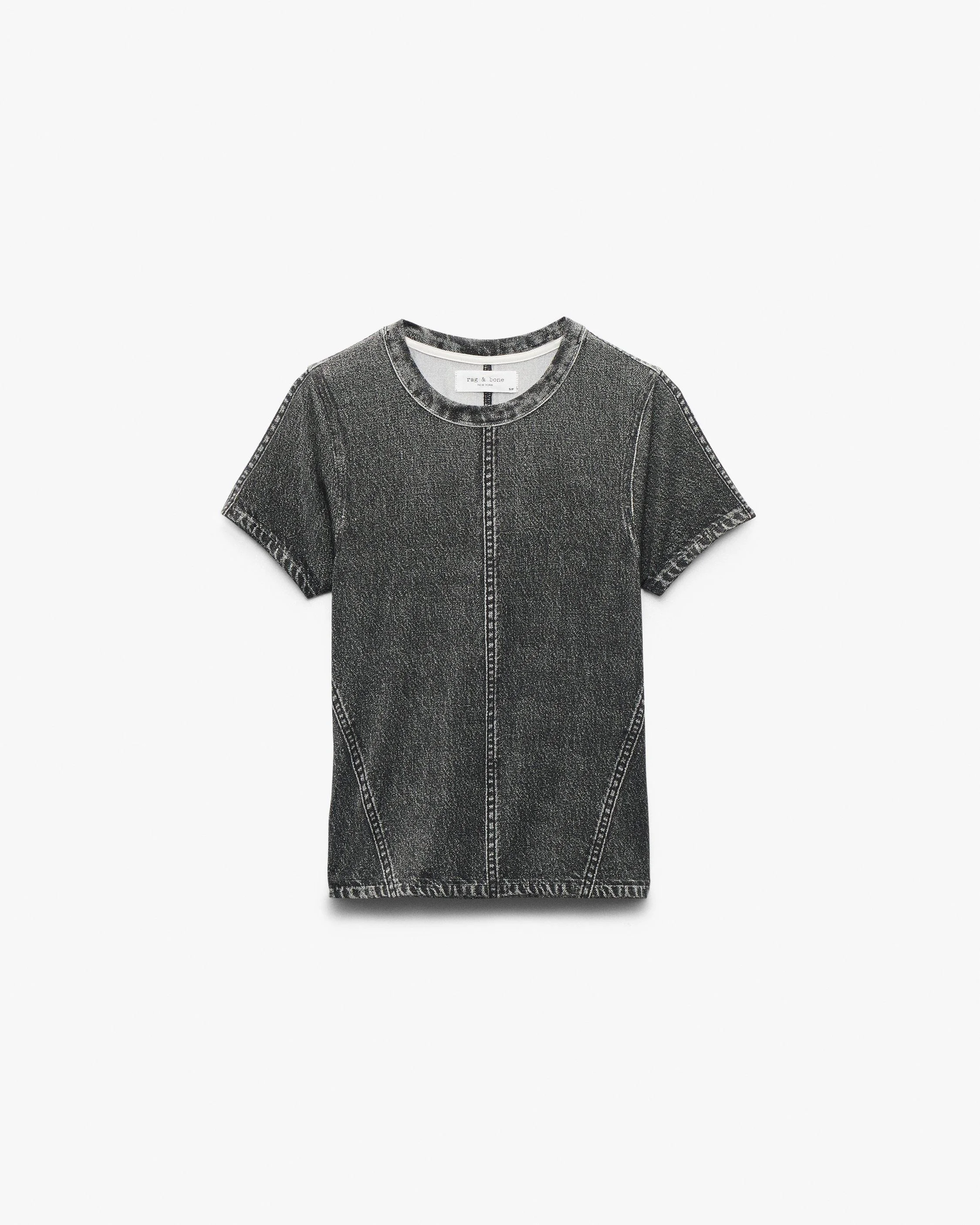 Whether you're getting to know (or already adore) Miramar, our revolutionary printing technique that makes any material look like denim, you'll love it in our new jersey fabric. This modern take on the baby tee is cut and sewn from stretchy, ultra-soft jersey that's printed on the outside to look like a denim T-shirt. Breathable and figure-flattering, the unlined style further achieves its comfortable fit and feel with the seams and other denim details digitally printed on the fabric. Size & Fit • Fits true to size • Size Small: Body length 20", chest 30", sweep 29.5", sleeve length 12.5" • Model is 5'10" wearing size small Features & Details • 95% modal, 5% spandex • Machine wash cold inside out & tumble dry low • Imported Product ID: RC0725FBMKT