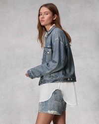 The classic trucker jacket, reimagined. Crafted in Miramar, a super soft cotton terry that looks like denim, feels nothing like it. In Walker, a medium indigo blue with printed rivets, pockets and seams. Size & Fit Fits true to size, hits below the waist Size Small: 41 1/2" chest, 37 1/4" sweep, 22 3/8" front length, 32 1/2" sleeve length Model is 5'8.5" wearing a size small Features & Details 100% Cotton Machine wash cold, turn garment inside out, do not bleach or tumble dry, lay flat to dry Metal logo buttons at center front and cuffs, printed logo buttons at waistband and pockets, unlined Button Closure Front welt pockets at sides, printed chest pockets Imported Product ID: WCW24P40008200