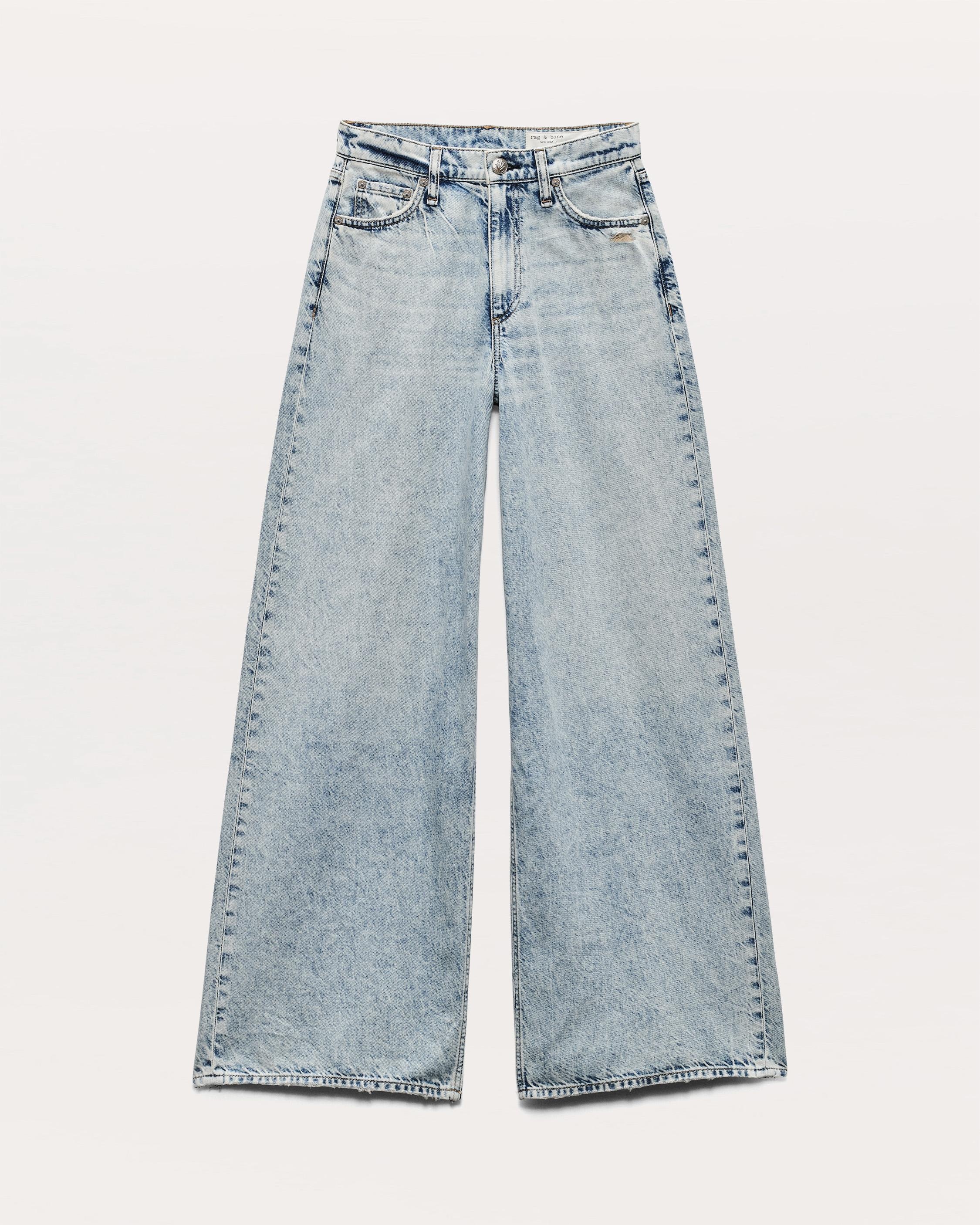 The Sofie. High-rise jeans that are rag & bone office favorites, with wide, full legs. Crafted from our Featherweight denim that's supremely soft and super light, with an easy drape. In Bellport, a light indigo with a slight acid wash. Size & Fit High-rise wide leg, full length Size 26: 12" front rise, 33" inseam, 25 1/4" leg opening Model is 5'10.5 wearing size 25 Features & Details 64% Cotton, 36% Lyocell Featherweight Denim in Bellport, a light indigo with a slight acid wash. Machine wash cold inside out with like colors, gentle cycle, do not use bleach, hang to dry, low iron if need, color may transfer. Zip fly with signature dagger button closure and metal rivets Five-pocket silhouette Imported Product ID: WDD25S2952FWBE
