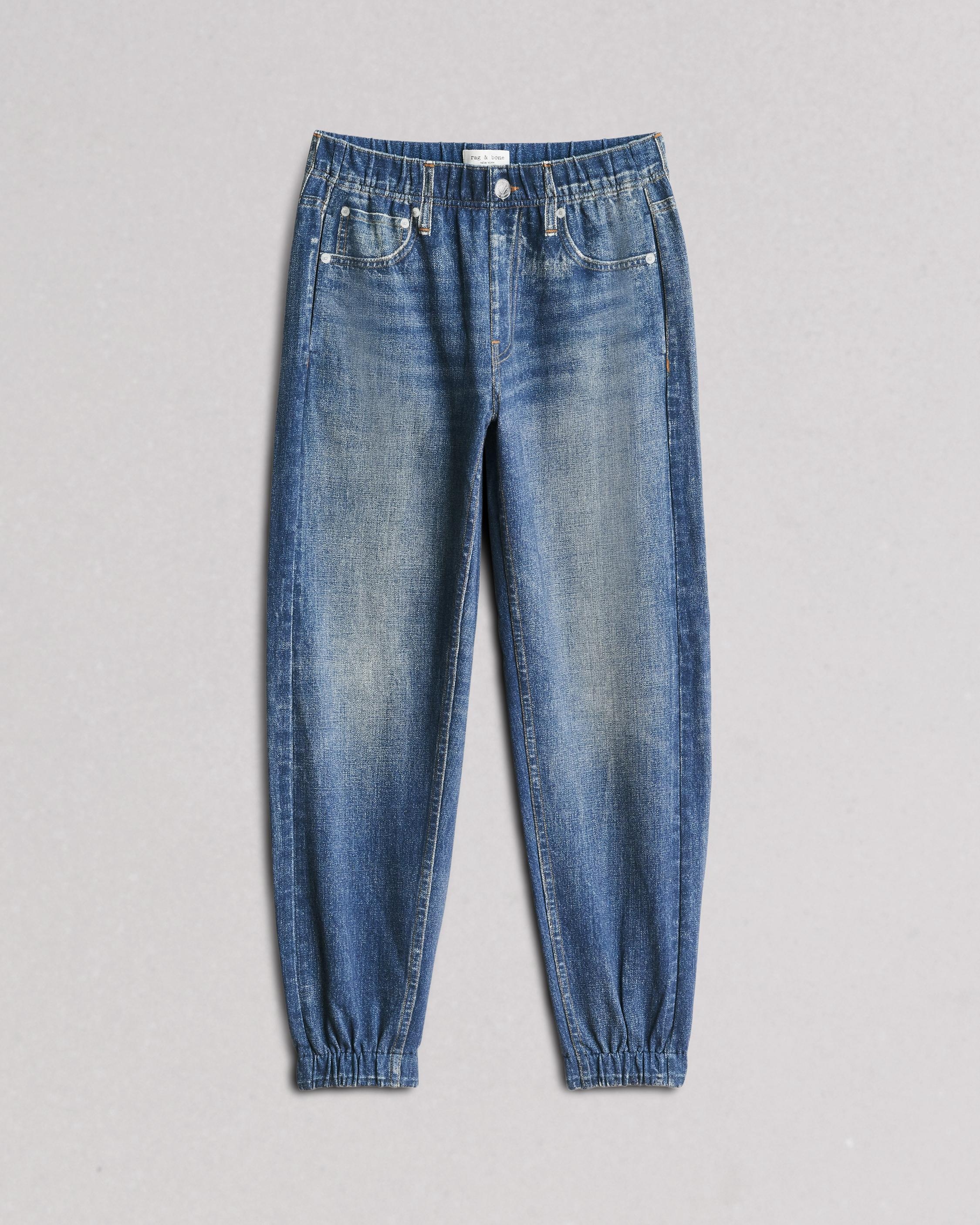The Miramar Jogger. Crafted with a super-soft cotton terry and printed to look like your favorite high-rise denim jeans. Features side seam pockets, elastic at the waist and ankle, and printed pockets. Really does look like denim. Really feels nothing like it. In Meadow, a light blue. Size & Fit Size Small: 10 1/2" Rise, 28 1/2" Inseam, 10" Leg Opening Features & Details 100% Cotton High-stretch, light indigo print Machine wash cold. Turn garment inside out. Do not bleach. Lay flat to dry. Do not tumble dry Elastic waist and ankles Printed belt loops, printed zip button fly, printed rb embroidery, printed rivets Side seam pockets, printed five-pocket silhouette Imported Product ID: WCW23F70008200