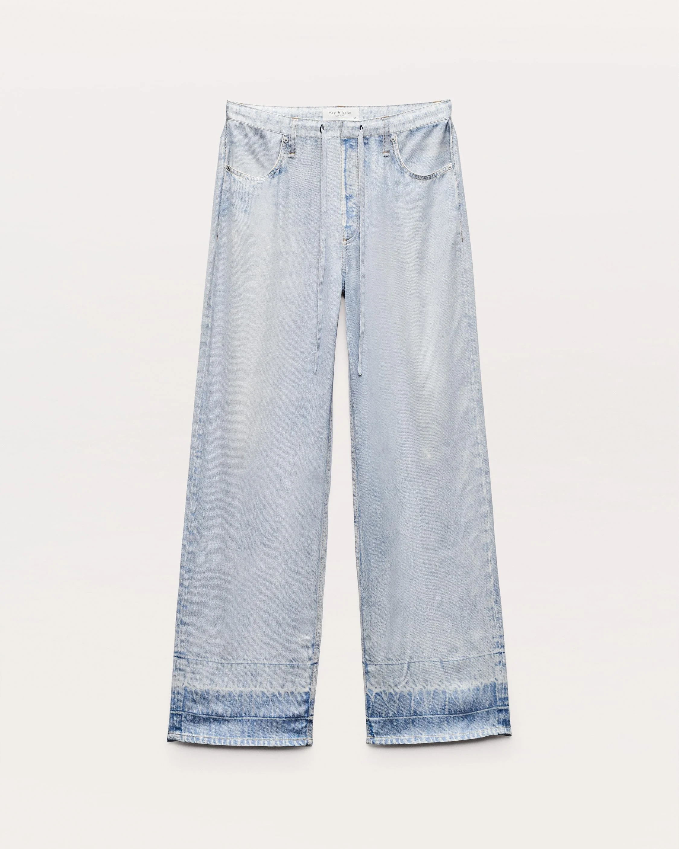 Whether you're getting to know (or already adore) Miramar, our revolutionary printing technique that makes any material look like denim, you'll love it in liquid satin. Part of our all-new Miramar Satin collection, these wide-leg pants are cut and sewn from fluid, lightweight satin with a beautiful drape and are printed on the outside to look like your favorite jeans turned into laid-back beach pants. Featuring functional belt loops, front scoop pockets, and a drawstring waistband, the relaxed style further achieves its comfortable fit and feel with the back pockets and denim details digitally printed on the fabric. Size & Fit • Mid rise, relaxed wide, full-length leg • Fits true to size • Size Small: 12" front rise, 30.5" inseam, 20" leg opening • Model is 5'11" wearing size small Features & Details • 50% viscose, 50% rayon • Machine wash cold with like colors & tumble dry low • Non-chlorine bleach & cool iron only if needed • Trompe l'oeil denim print on liquid satin • Digitally printed zip fly, rivets, and rb embroidery • Self drawstring at the waist • Functional belt loops • Unlined • Drawstring waistband • Functional front pockets • Digitally printed back pockets and coin pocket • Imported Product ID: WCW25P7001ST01