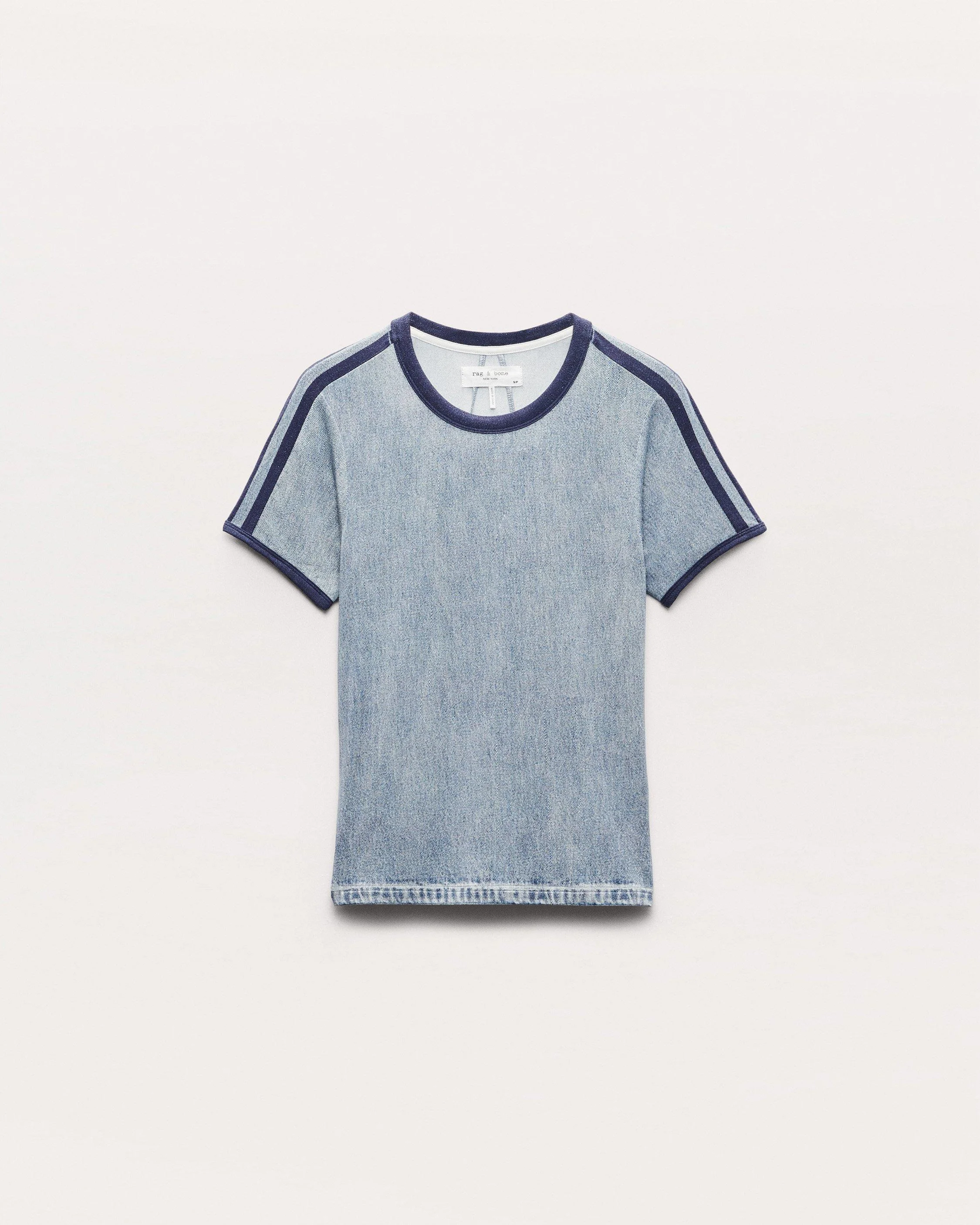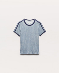 Whether you're getting to know (or already adore) Miramar, our revolutionary printing technique that makes any material look like denim, you'll love it in our new jersey fabric. This modern take on the baby tee is cut and sewn from stretchy, ultra-soft jersey that's printed on the outside to look like a denim T-shirt. It features a contrast collar, cuffs, and sporty stripes along the sleeves, plus our signature V-seam detailing at the back. Breathable and figure-flattering, the unlined style further achieves its comfortable fit and feel with the other seams and denim details digitally printed on the fabric. Size & Fit • Slim fit • Fits true to size • Size Small: Back length 19.5", chest 30", sweep 29.5", sleeve length 5.75" • Model is 5'11" wearing size small Features & Details • 95% modal, 5% spandex • Machine wash cold inside out & tumble dry low • Trompe l'oeil denim print on jersey fabric • Printed seams and shoulder tape • Unlined • Imported Product ID: RC4625PSMJR