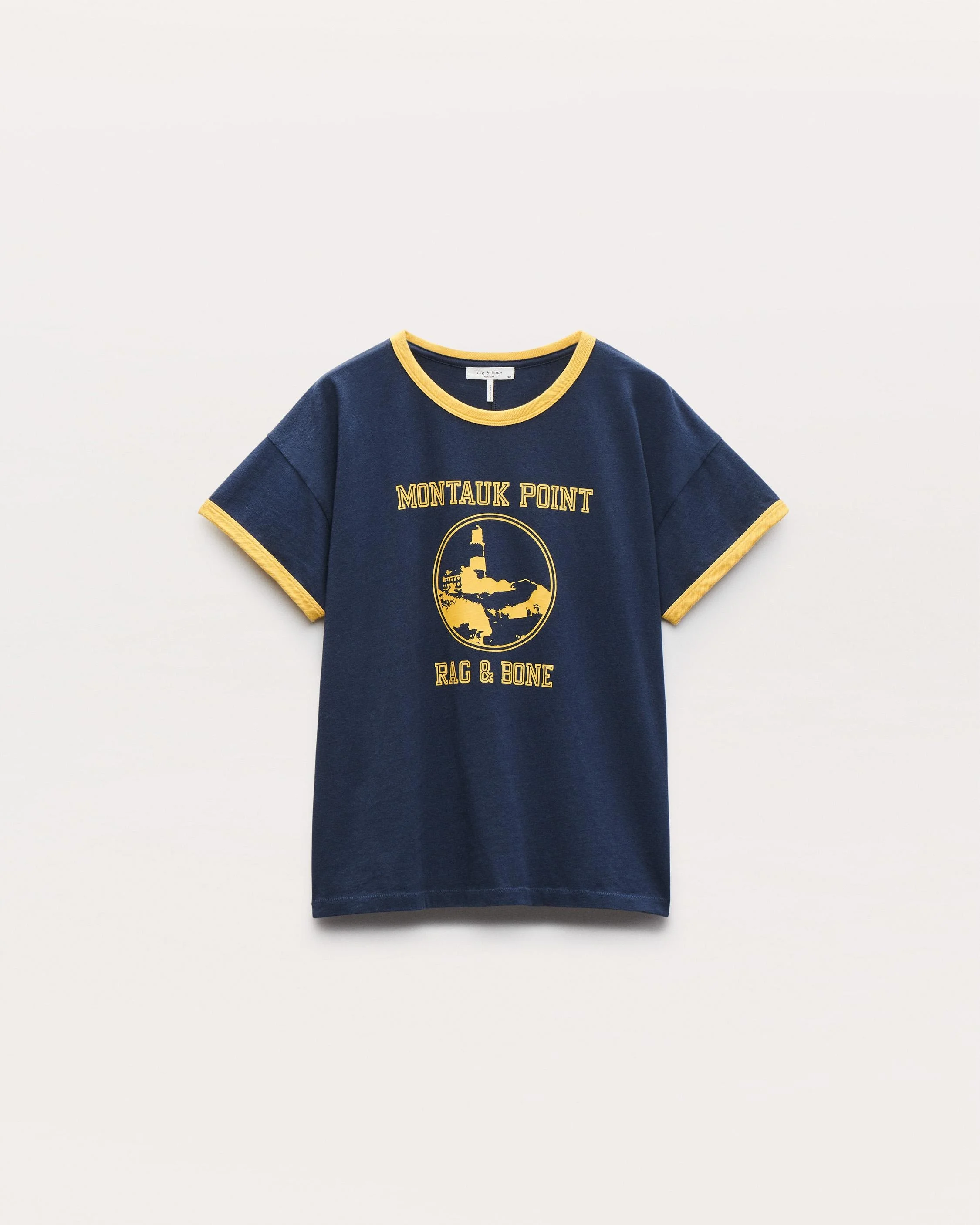 East Coast classic. Like a wearable postcard from Montauk, this ringer tee features a custom lighthouse print and varsity-style lettering that channels Long Island's storied shoreline with an old-school athletic twist. It's cut for a slightly boxy fit from Peruvian cotton jersey that feels soft & smooth. Size & Fit • Boxy fit • Fits true to size • Size Small: body length 23.5" | chest 39" | sweep 42" | sleeve length 4.25" • Model is 5'11" wearing size small Features & Details • 100% cotton • Rb Montauk graphic custom-illustrated by rag & bone studio • Machine wash cold on delicate & tumble dry low or dry clean • Made in Peru Product ID: WCC25PT023MI24