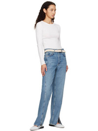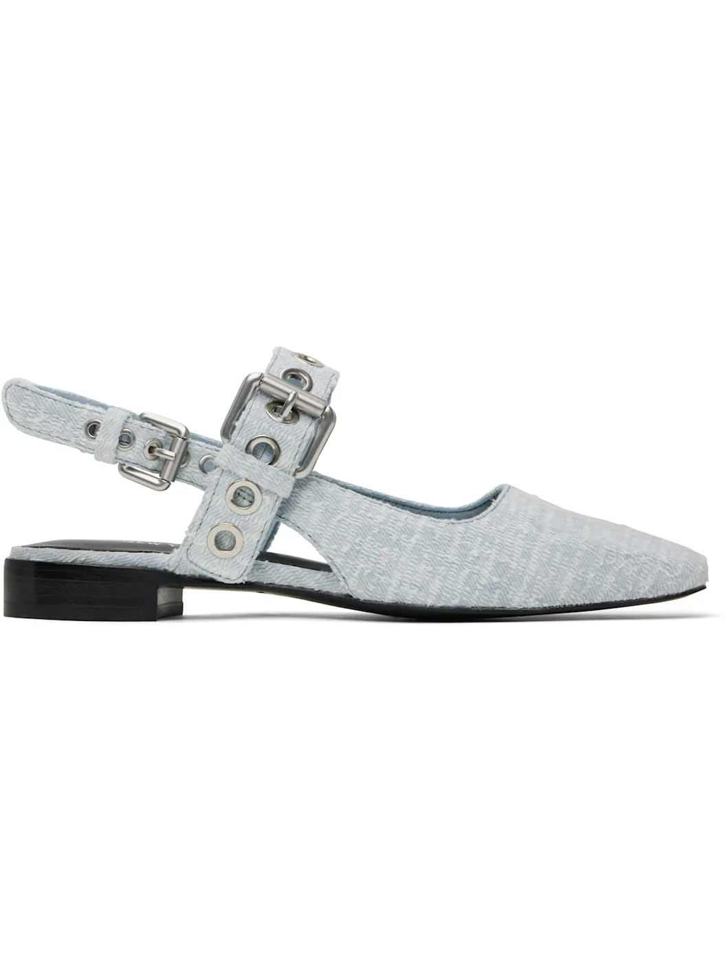 Denim slippers in blue. · Fading and distressing throughout · Square toe · Partially elasticized pin-buckle vamp strap and slingback strap · Buffed leather lining · OrthoLite® Recycled™ and OrthoLite® Lazy-Hybrid™ insole · Logo stamp at cushioned insole · Stacked leather heel with rubber injection · Polished leather sole · Logo-engraved antiqued silver-tone hardware Supplier color: Sky blue/Denim tweed Upper: textile. Sole: leather. Made in Viet Nam 251055F118015