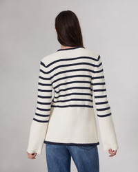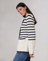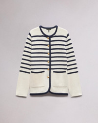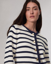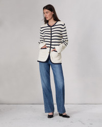 The Nancy. Some things never go out of style. Our best-selling lady jacket cardigan is now updated in a longer fit and punctuated with gold cap buttons, it's crafted in a luxurious blend of organic cotton and extra fine merino wool. Size & Fit Relaxed fit Size Small: Body length 26 ", chest 38", sweep 39 1/2", sleeve length 24 1/4" Model is 5'10.5" wearing a size small Features & Details Self: 53% Extra Fine Merino Wool 28% Recycled Nylon 18% Organic Cotton 1% SpandexTrim 1: 49% Extra Fine Merino Wool 33% Recycled Nylon 16% Organic Cotton 2% SpandexTrim 2: 55% Extra Fine Merino Wool 25% Recycled Nylon 20% Organic Cotton Dry clean only. Metal buttons Imported Product ID: WAS24F055US55