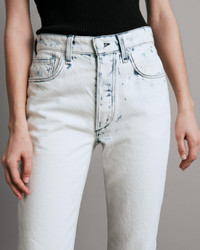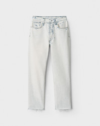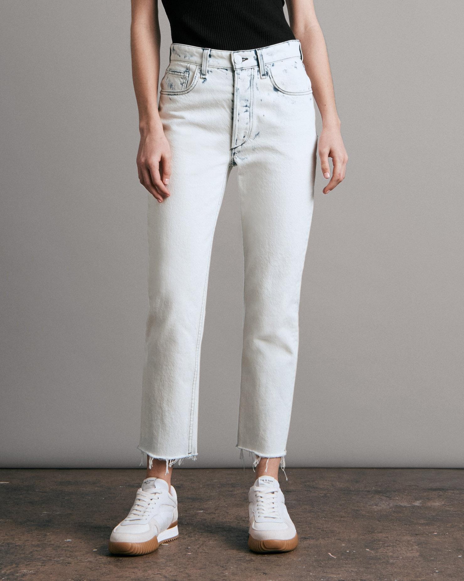The Nina is a straight leg jean with a high-rise that sits just below the waist. Slim through the hip and thigh with an elongated silhouette. This Nina has an almost-white bleached wash, giving the modern white jean a whole new look. Perfect for summer days. Size & Fit High-rise ankle cigarette, sits below natural waist, slim through hip and thigh, cigarette leg True to size Size 26: Front rise 11", inseam 27 ", leg opening 13 1/2" Model is 5'9" wearing a size 25 Features & Details Turkish fabric, bleached down wash with pops of indigo blue in some areas 100% Cotton Machine washable Dagger center front button, button front closure, washer rivets, small green paper patch, rag & bone embroidery with a cut off hem Button closure Five- pocket silhouette Made in USA Product ID: WDD22P2903B1HM