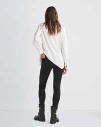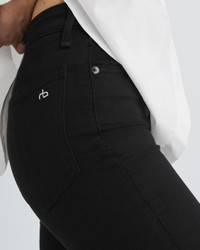 A classic high rise skinny fit jean crafted of high-quality Turkish stretch denim. Size & Fit High rise skinny fit, full length 10.5" rise, 30" inseam, 10" leg opening Model is 5'9" wearing a size 25 Features & Details 13.12 ounce Turkish stretch black denim in a rise black wash 43% Viscose 33% Cotton 17% Tencel 5% Polyester 2% Elastane Machine was cold inside out with like colors, do not use bleach, hang to dry, do not iron, indigo may bleed Classic donut shank button, washer rivet, zipper fly, eggshell rb embroidery with specialty hem Five-pocket silhouette Made in Mexico with imported materials Product ID: WDD21S2664N5BL