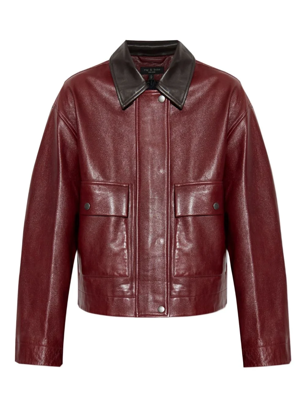 flap-pocket leather jacket Highlights - Burgundy - Lambskin leather - Contrasting collar - Button fastening - Buttoned pockets Imported Composition Lamb Skin 100% Washing instructions Read Manufacturer Guidelines