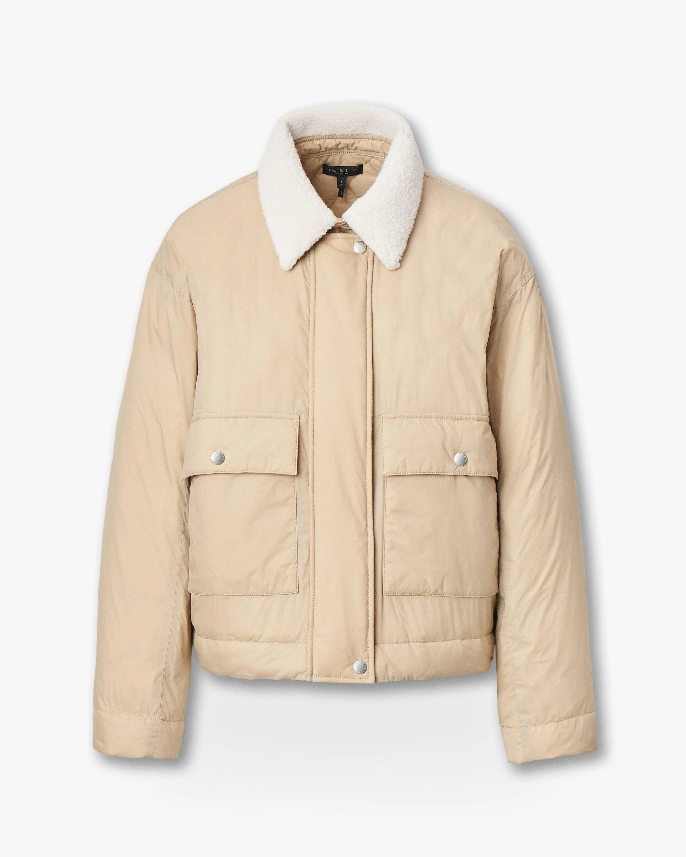 This puffer is cut for a cropped fit from flyweight nylon. A faux fur sherpa collar brings contrast, while a centered front zipper and pockets add ease. Your ultimate effortless throw-on-and-go jacket for colder days. This style runs large. For a closer fit, consider sizing down. Size & Fit • Relaxed fit • Fits true to size • Size small: Body length 24.75", back length 24.25", Chest 48", sleeve length 33" • Model is 5'8" wearing size small Features & Details • Body: 100% polyamide • Lining: 100% polyamide • Collar: 100% polyester • Fill: 80% duck down, 20% duck feathers • Quilted woven lining • Hidden zip- and snap-closure • Snaps at center front, collar & pockets • Two front waist flap pockets & two pockets at side seams • Dry clean only • Imported Product ID: RA1P25H0MOW