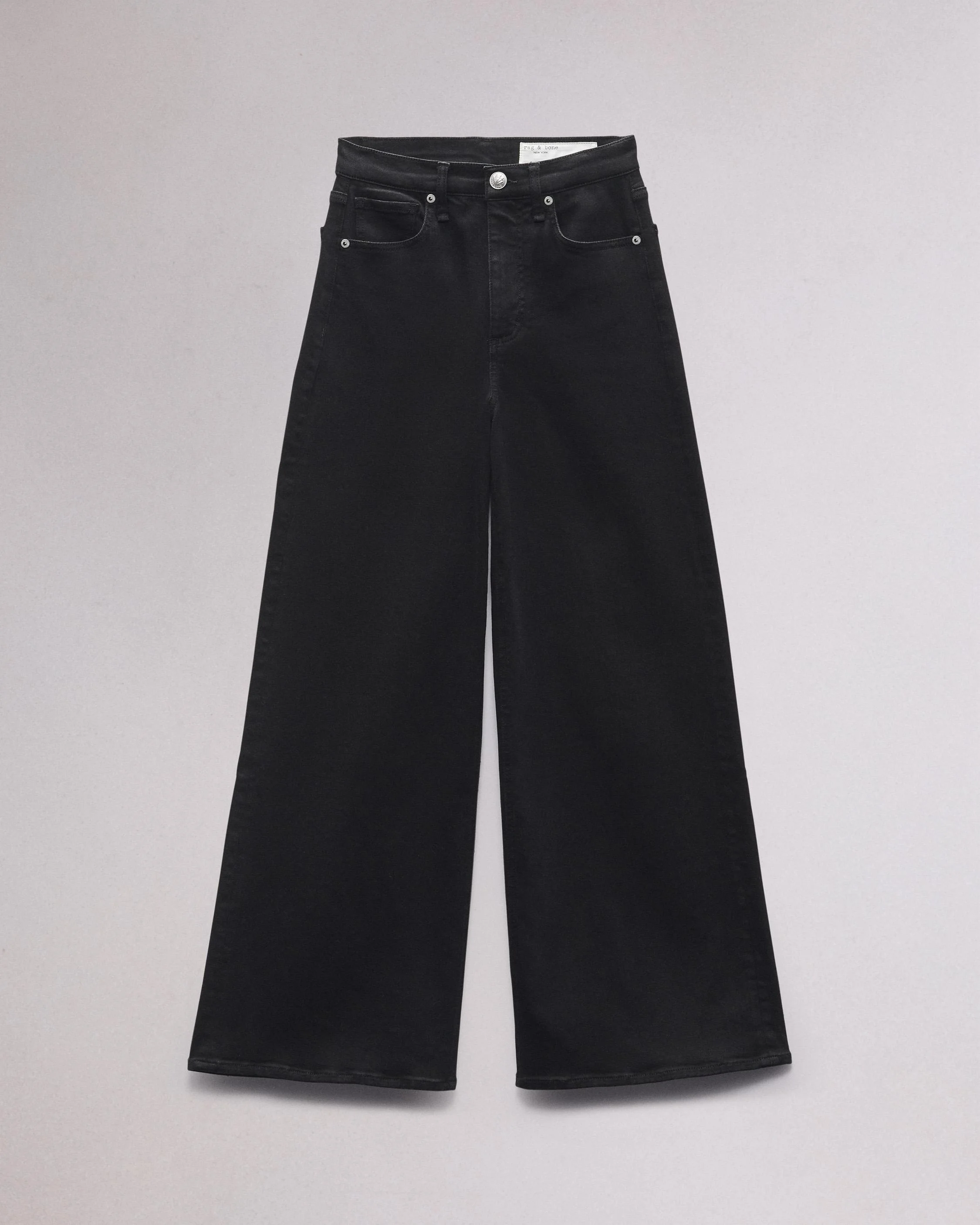The Sofie. This is our high-rise fit with a cropped wide leg that's a rag & bone office favorite. Crafted from our Flexi denim that smooths, sculpts, and stretches for ultimate comfort and style wherever life takes you. In Black with a clean hem. Size & Fit High-rise wide leg, ankle length Size 26 : 12" front rise, 30" inseam, 25" leg opening Model is 5'7.5" wearing a size 25 Features & Details 43% Viscose 33% Cotton 17% Tencel 5% Polyester 2% Elastane Flexi, black Machine wash cold inside out with like colors, gentle cycle, do not use bleach or tumble dry, hang to dry, low iron if need, color may transfer. Signature dagger button at center front with a zipper fly, metal rivets Clean hem Five-pocket silhouette Imported Product ID: WDD24F3000N5BL