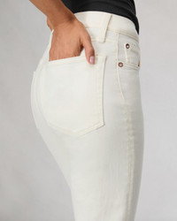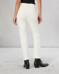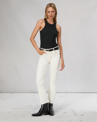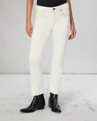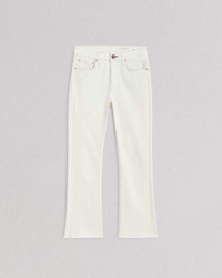 The Peyton. Our modern take on the timeless bootcut now in a crop with a slim fit through the thigh and a subtly flared hem. Crafted from High Stretch denim that shapes, smooths and gives generous stretch. In Ecru, a soft white with a raw, unfinished hem. Size & Fit Mid-rise bootcut, full length 9 3/4" rise, 27" inseam, 16 1/2" leg opening Model is 5'11" wearing a size 25 Features & Details 77% Cotton, 16% Lyocell, 5%Polyester, 2% Elastane High stretch, ecru Machine wash cold inside out with like colors, do not use bleach, hang to dry, warm iron if necessary, color transfer may occur. Hidden center front zipper, dagger tack button, washer rivet Eggshell rag & bone embroidery with a cut hem Five-pocket silhouette Imported Product ID: WDD23H2917BREC