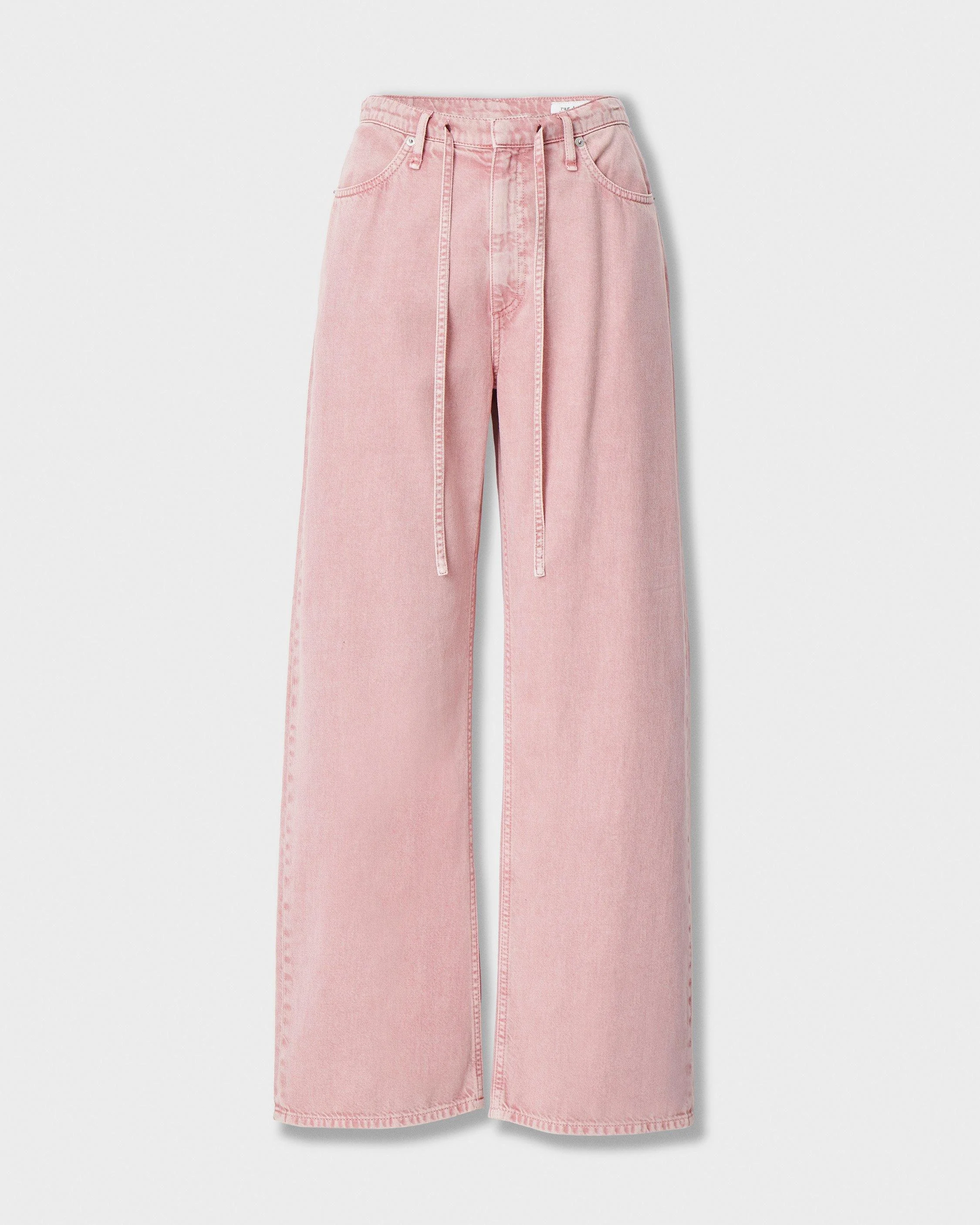 The Phoebe. Mid-rise jeans made for warmer days with a relaxed leg and a drawstring waistband. (Style tip: These fit like The Logan , but with a more laid-back vibe). Crafted from our Featherweight denim that's supremely soft and super light, with an easy drape. Feels airy & effortless. In Raspberry, a soft, washed pink. Size & Fit • Mid-rise • Relaxed fit with a wide leg • Fits true to size • Size Small: Rise 11.5", inseam 30.5", leg opening 20" • Model is 5'10" wearing size small Features & Details • 60% cotton, 40% lyocell • Featherweight Denim in Rasberry, a soft, washed pink • Zip fly with a hidden hook-and-bar closure • Branded washer rivets • Self tie • Five-pocket jean • Machine wash cold inside out on delicate & hang to dry • Color may transfer • Imported Product ID: RJ6126S1FRS