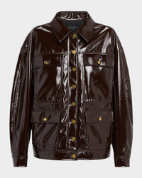 Crafted in a rich red wine hue, the "Amy" faux patent leather jacket by Rag amp; Bone features a boxy silhouette with an interior drawcord to cinch the waist. Point collar Long sleeves with button cuffs Dual chest and hip flap pockets Relaxed fit Hem falls to the hip Buttonfront Polyester/cotton Dry clean Imported