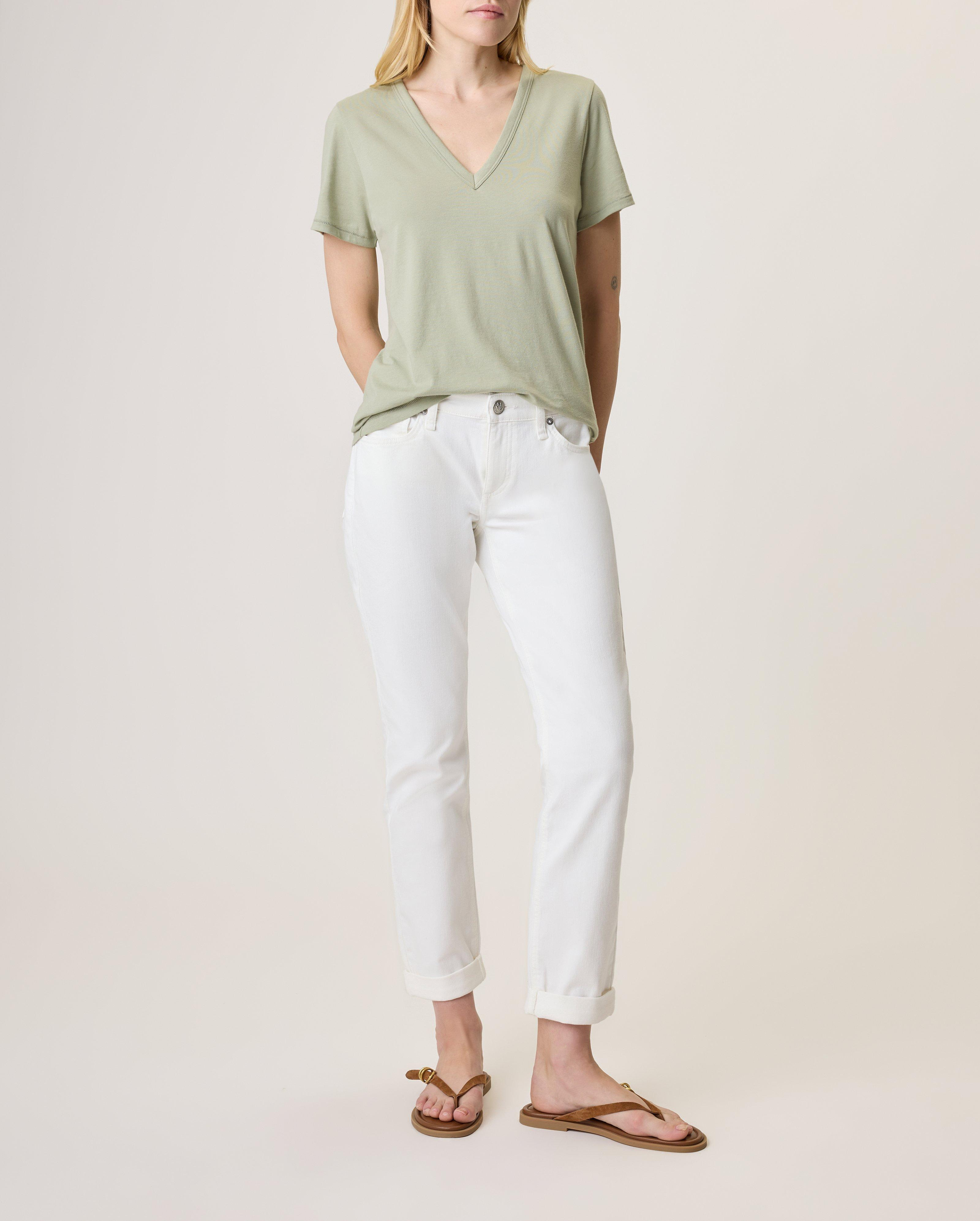 Designed to be the core of your wardrobe. Our classic V-neck tee is cut with short-sleeves from fluid cotton-viscose jersey. Size & Fit • Classic fit tee • Size Small: Center back length 25", chest 34 1/2", sweep 38", sleeve length 7" • Model is 5'9" wearing size small Features & Details • 50% Cotton, 50% Viscose • Machine wash cold, gentle cycle, do not bleach, tumble dry low, low Iron if needed or dry clean • Made in Peru Product ID: W286C88J4O
