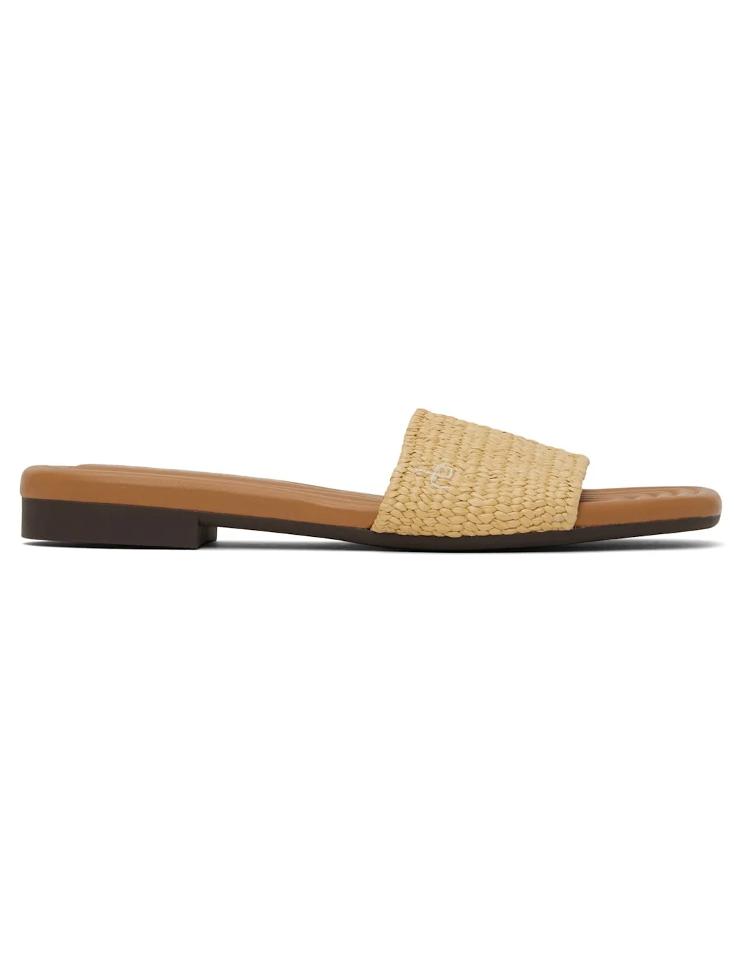 Woven slip-on flat sandals in tan. · Open square toe · Embroidered logo at vamp · Logo stamp at quilted faux-leather footbed · Treaded rubber sole Supplier color: Natural Upper: textile, synthetic. Sole: rubber. Made in Viet Nam 251055F124005
