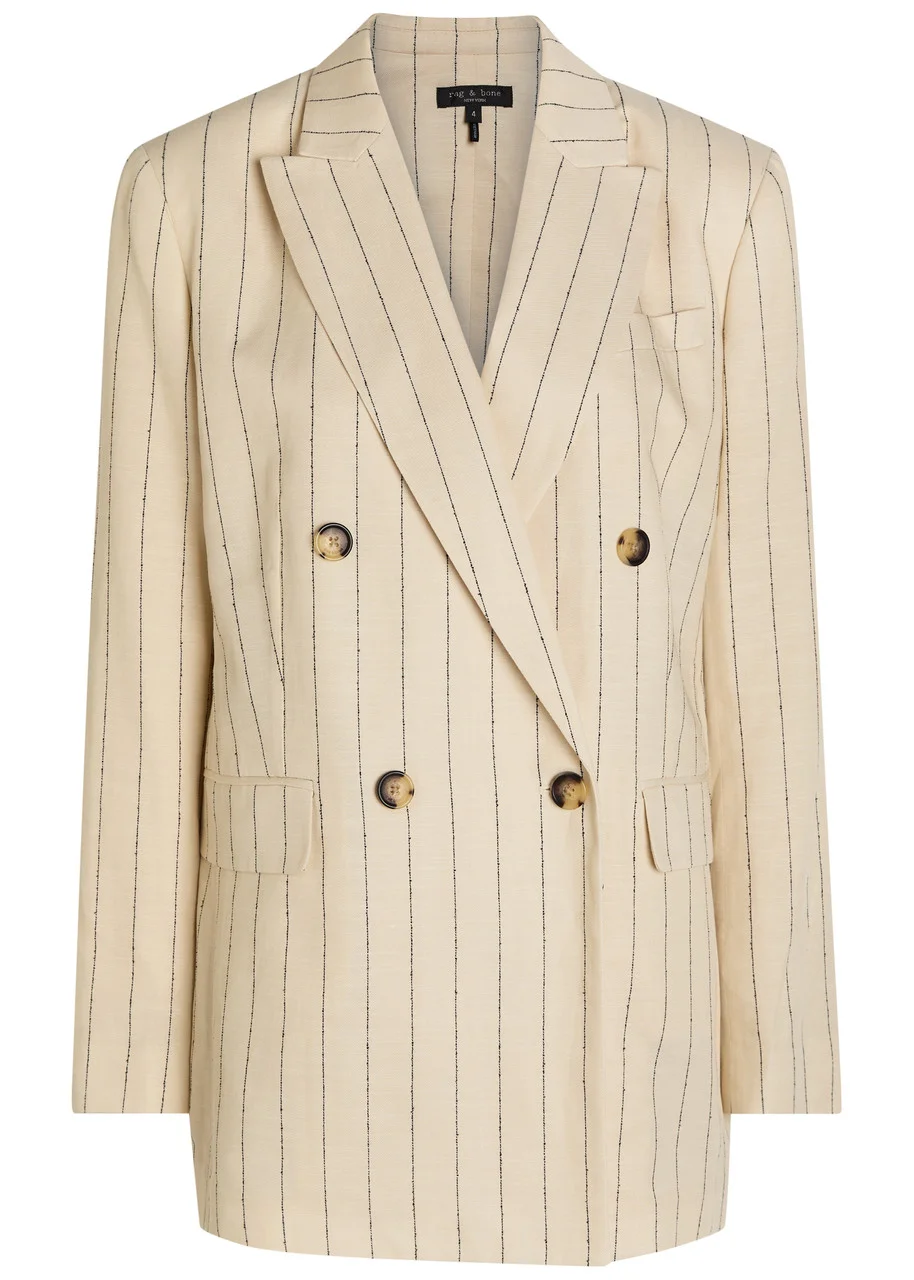 Info & Care Rag & Bone woven;blazer Pinstriped, peaked lapels, button-fastening cuffs, chest slit pocket, front flap pockets, sleeve lining Double-breasted button fastenings through front 29% polyester, 27% linen, 26% cotton, 18% viscose Machine wash Coordinating items available Size & Fit Length shoulder to hem: 29 inches/ 73.5cm Midweight Regular fit Model is 5'10"/ 178cm and wears a size;US4