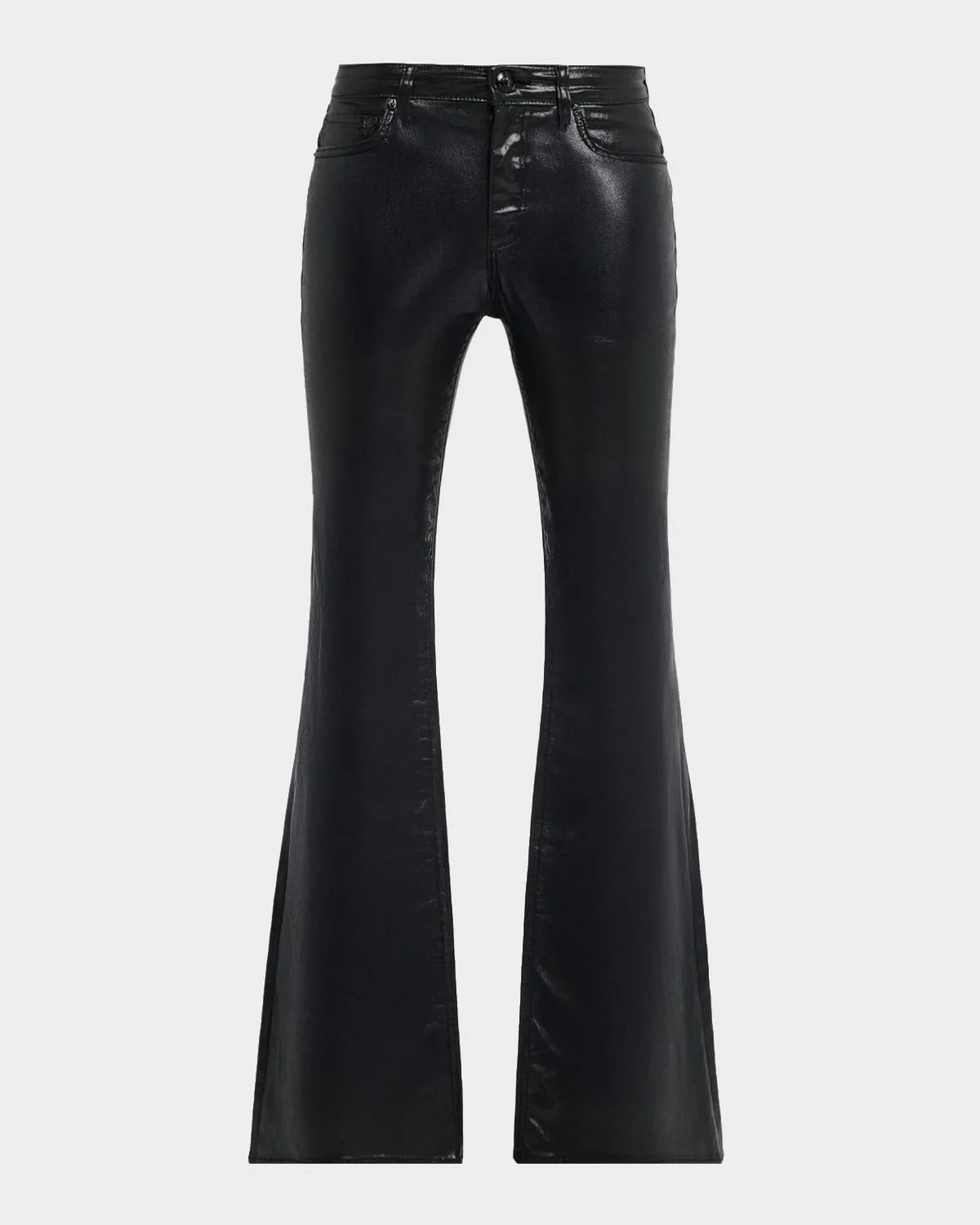 Rag amp; Bone "Flexi Dahlia" flare jeans crafted from superstretch coated denim Approx. 10.5" rise; 33" inseam Midrise; sits high on the hip Fivepocket style Fitted through the hip and thigh Full length Button/zip fly; belt loops Cotton/polyester/elastane Machine wash cold Imported