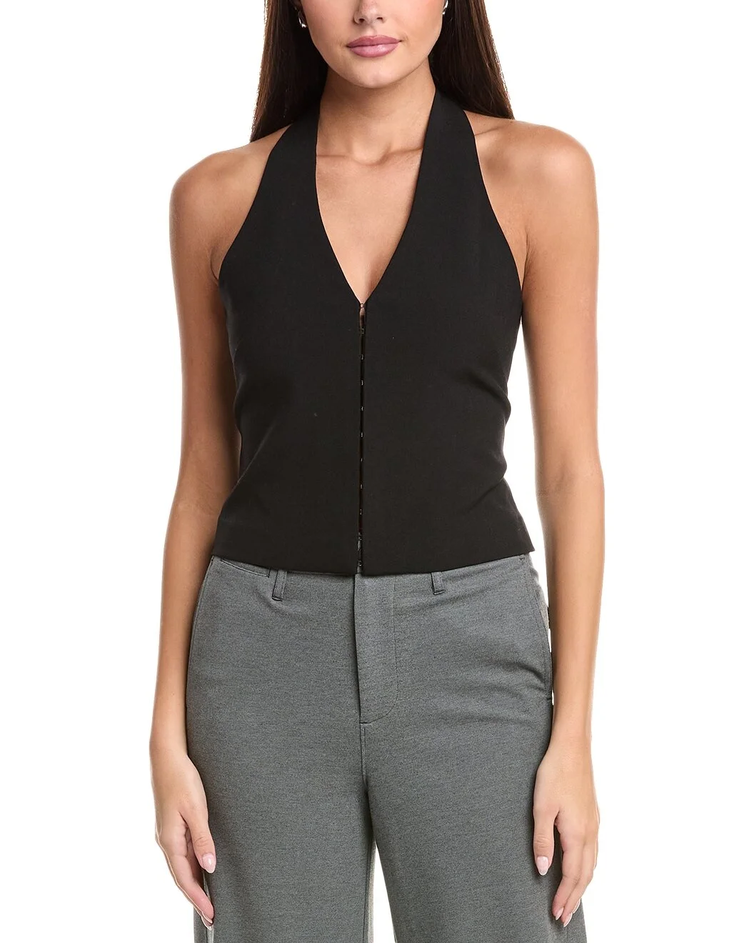 - Color/pattern: black - Approximately 20in from shoulder to hem - Model is 5'10.5 and is wearing a size 4. Measurements may vary slightly by size. - Design details: halter neck - Hook-and-eye closures - 52% wool, 43% polyester, 5% polyurethane - Dry clean only - Imported - WARNING: - CA Residents - Prop 65