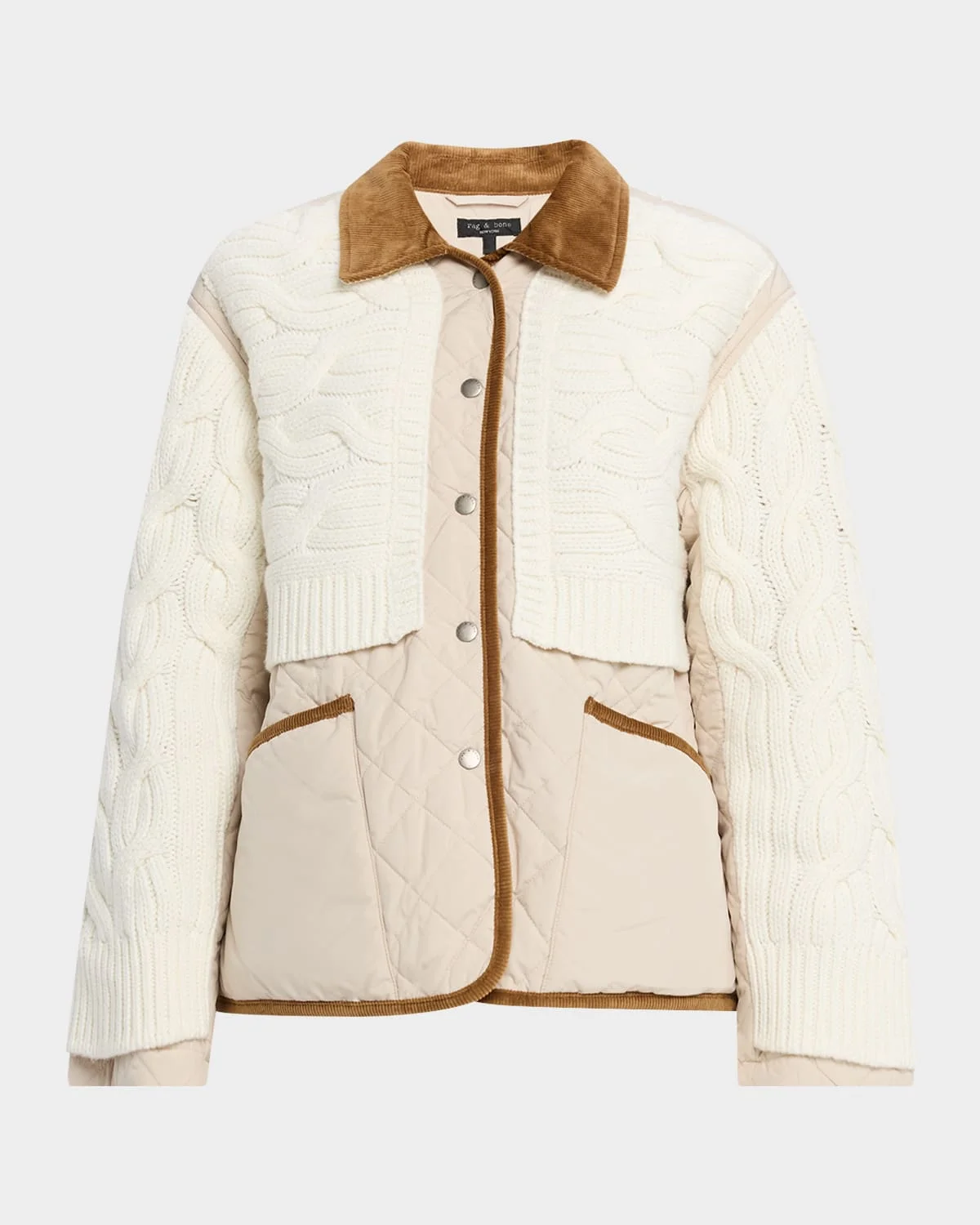 The "Ivy" jacket by Rag amp; Bone features a mixedmedia silhouette with cableknit and corduroy detailing that engulfs you with warmth and style. Spread collar Dropped shoulders Long sleeves Patch pockets Relaxed fit Snapfront Polyester Dry clean only Imported
