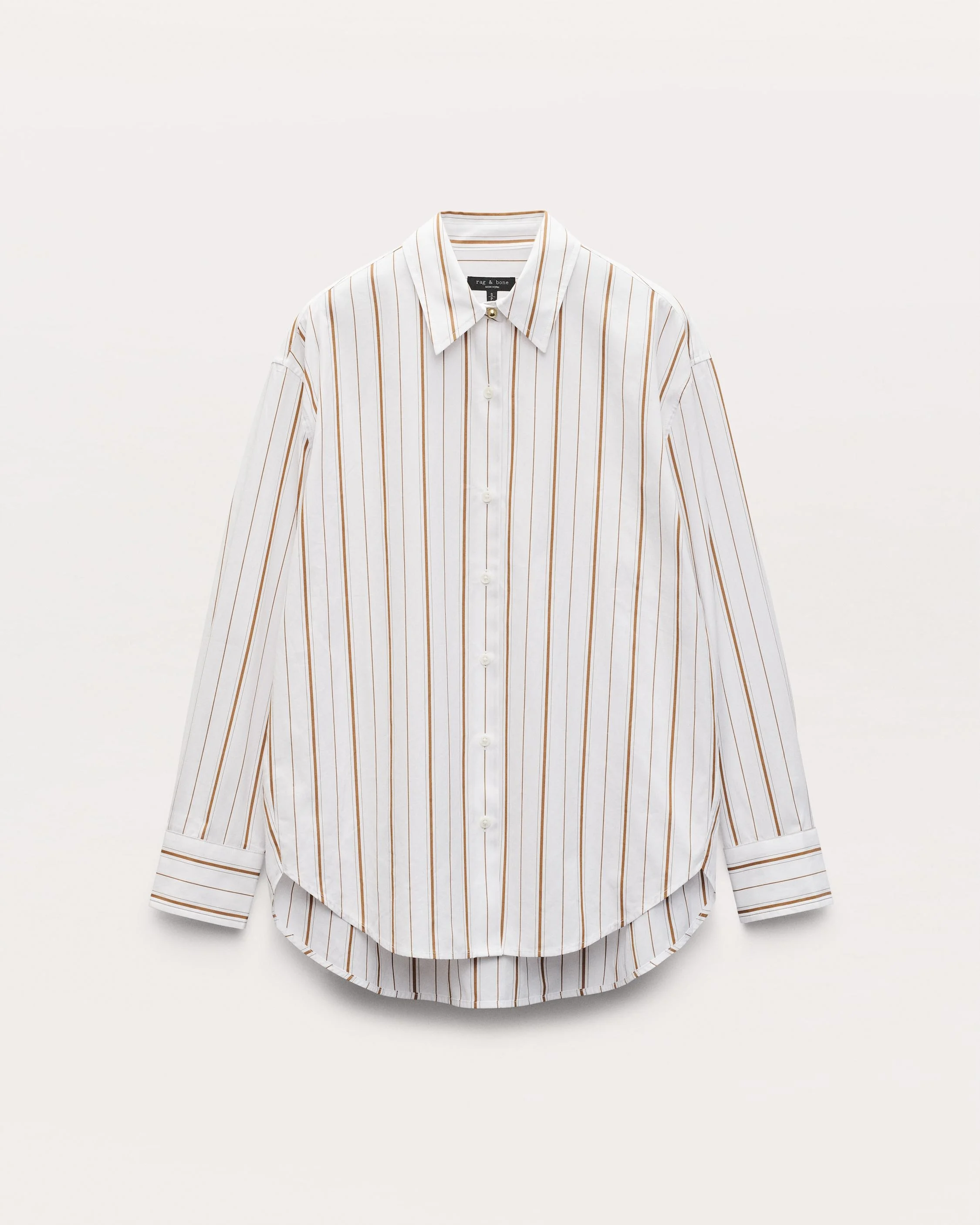 Tailored to stand apart. Cut from crisp, weighty cotton poplin milled in Italy, this striped shirt is the definition of everyday luxury. A polished gold ball button at the collar adds a sculptural note to its clean, structured silhouette. Size & Fit • Classic fit • Fits true to size • Size Small: Back length 30", chest 54.25", sweep 46.25", sleeve length 32.5" • Model is 5'9" wearing size small Features & Details • 100% cotton • Machine wash cold & lay flat to dry or dry clean • Metal ball button at collar • Faux horn buttons at center front, sleeve cuffs, and sleeve plackets • Unlined • Button closure • Imported Product ID: WAW25PA0228122