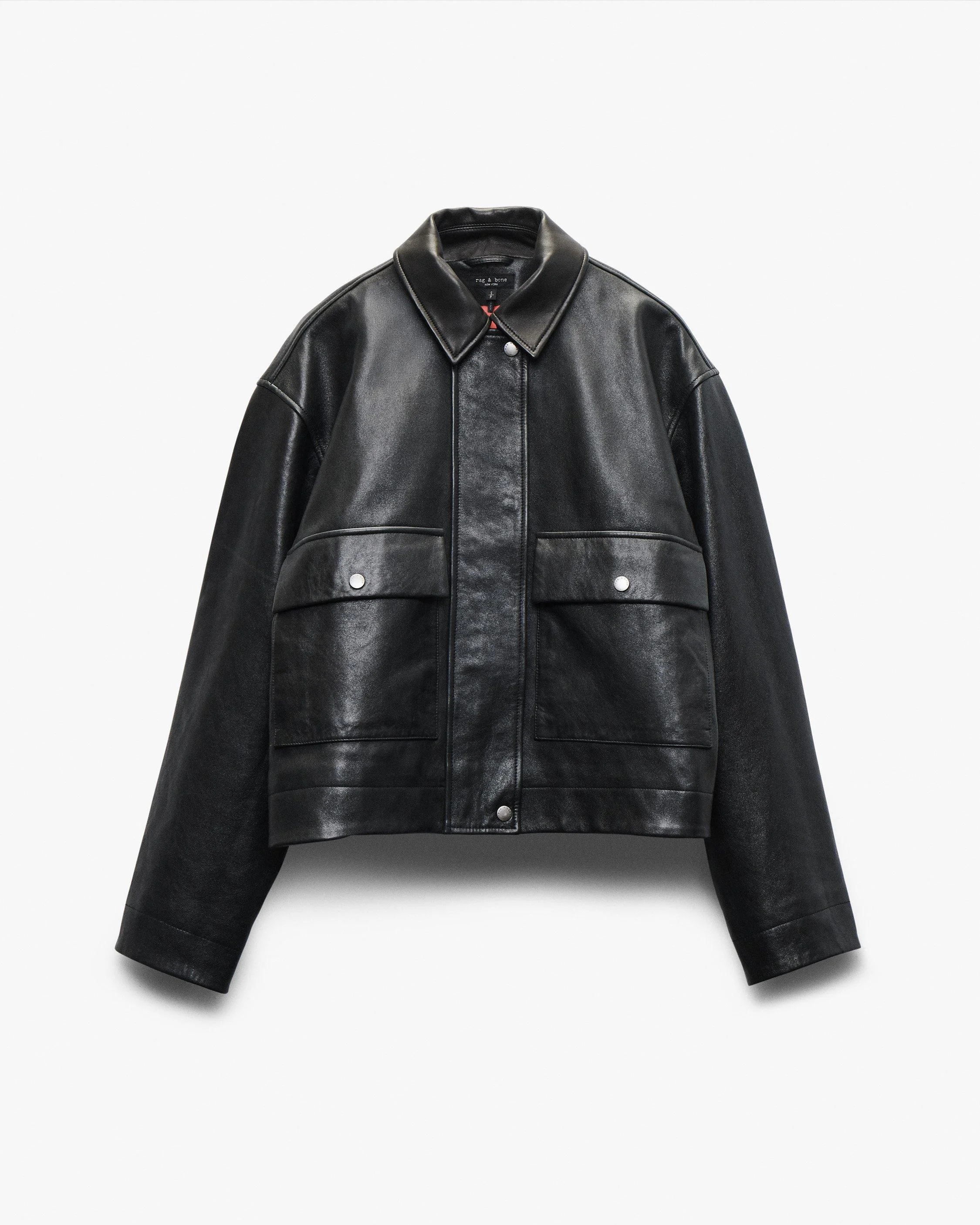 One of our best-selling jackets. Updated in soft-yet-structured lambskin with a vintage-inspired, lived-in look and feel. Combined with a cropped, boxy fit and a silky quilted lining, this is the one you'll reach for every season, year after year. Size & Fit • Croppped fit, slightly oversized • Fits true to size • Size Small: Body length 23.5", back length 22.75", chest 47", sleeve length 33" • Model is 5'11" wearing size small Features & Details • Body & collar: 100% lamb leather • Lining: 100% polyester • Professional leather cleaner only • Hidden zipper at center front • Exposed and hidden snaps at center front flap, collar & pockets • Patch pockets on front • Zipper and snap closure • Imported Product ID: RA5A25F0MCR