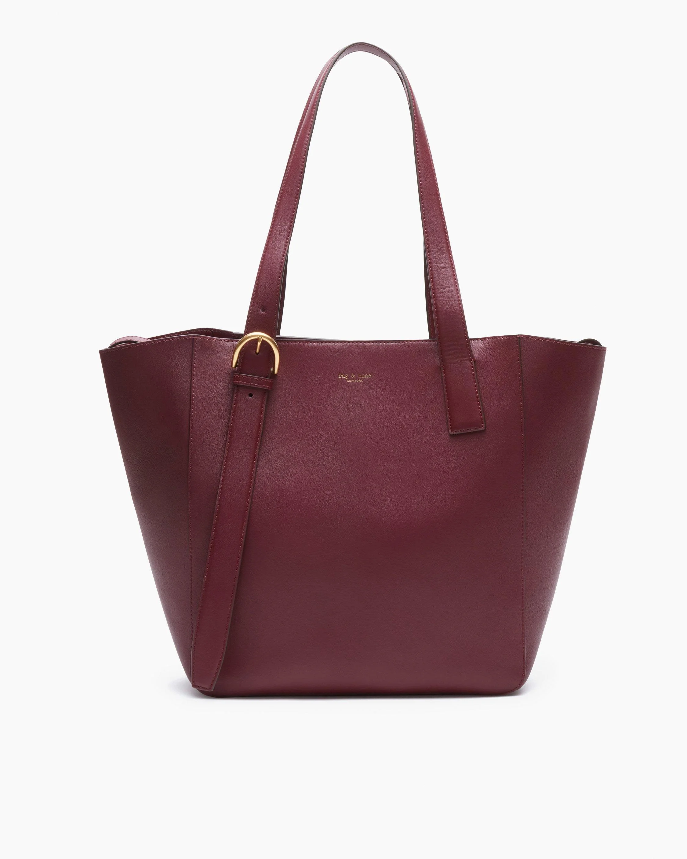 Quietly capable. Sculpted from buttery leather, this minimal tote bag makes its point with a soft form roomy enough for most laptops. Finished with adjustable handles, it seamessly switches between dressed up and dialed down depending on the day's demands. Size & Fit • Dimensions: 21.3" x 5.5" x 13.4" • Strap length: 14"-16" Features & Details • 100% cow leather • Professional clean only • Metal clasp closure • Dust bag included • Imported Product ID: LE101325