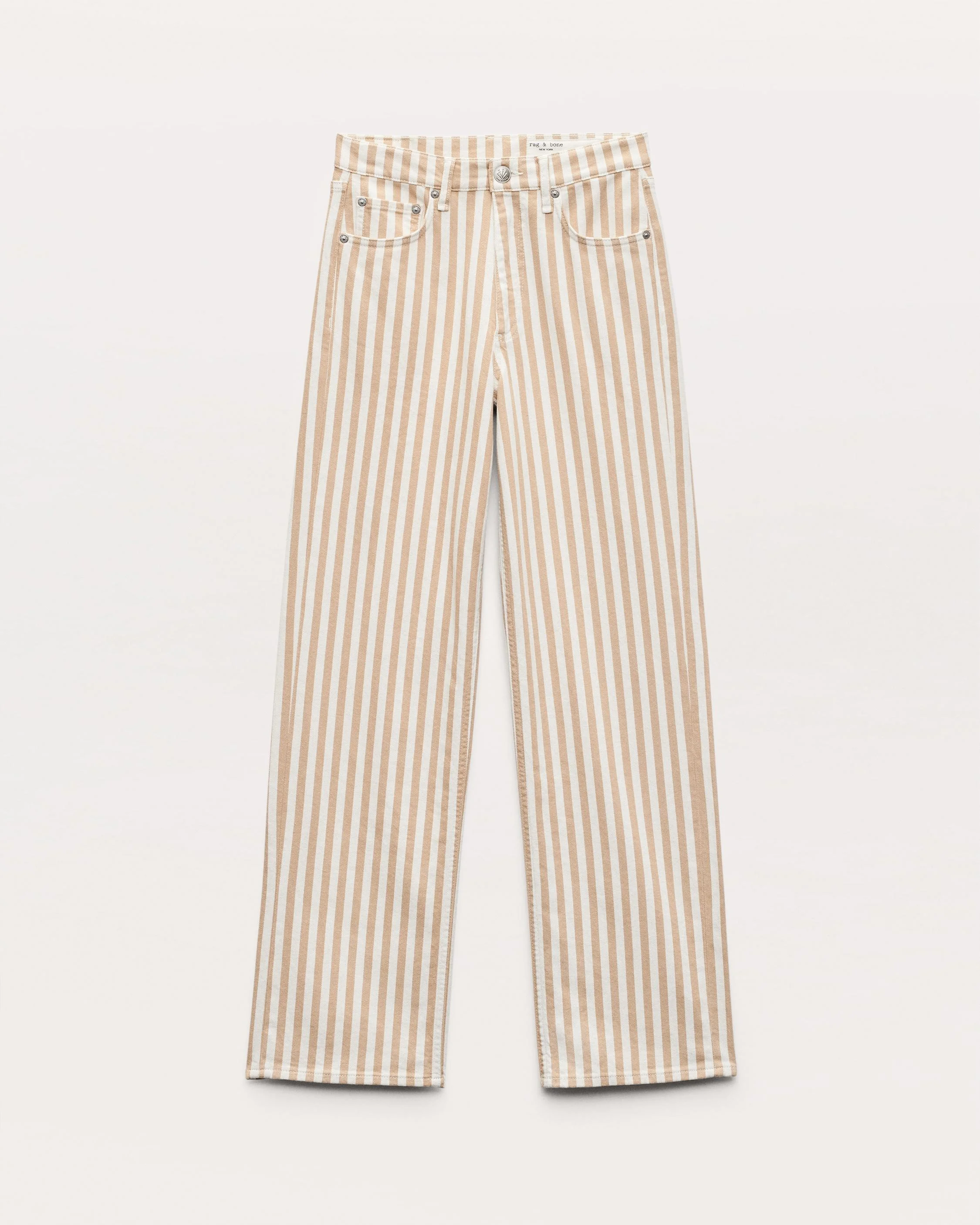 The Shea. Full-length high-rise jeans designed with relaxed, straight legs. Crafted from our Vintage Stretch denim for a broken-in look & feel with a comfortable touch of stretch. In Tan Stripe, a summery take on the classic pattern. Size & Fit • High-rise • Relaxed straight, full-length leg • Size 26: 12" front rise | 32" inseam | 18" leg opening • Model is 5'11" wearing size 25 Features & Details • 85% cotton, 13% linen, 2% elastane • Vintage Stretch Denim • In Tan Stripe, a summery pattern of vertical tan and ecru stripes • Zip fly with a button closure • Signature dagger tack buttons & washer rivets • Five-pocket pant • Machine wash • Imported Product ID: WDD25P1007VSTS