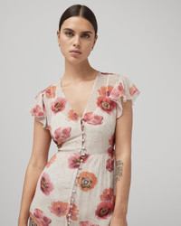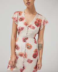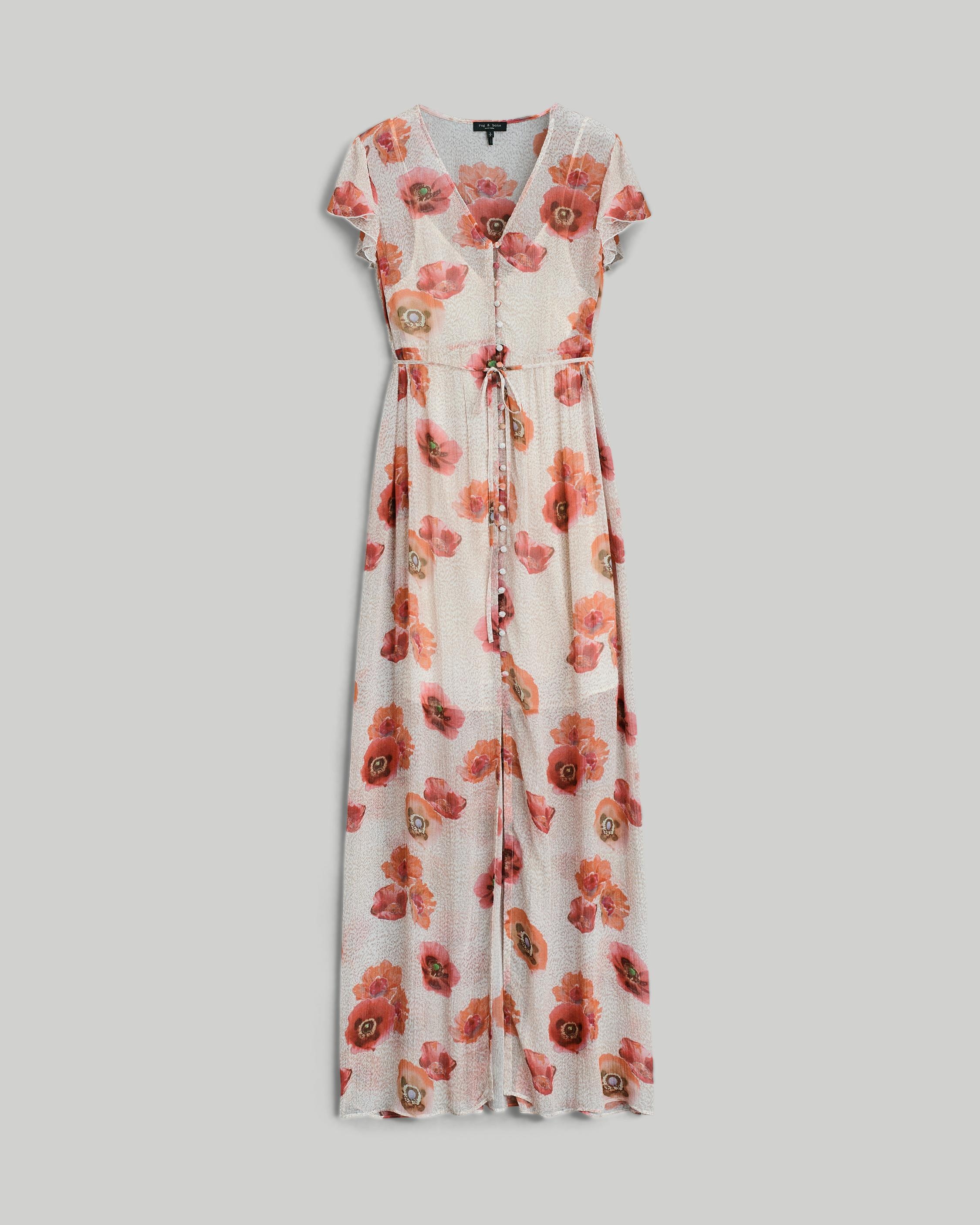 Raine is our feminine maxi dress crafted from crinkle chiffon fabric in a custom floral print. Complete with fabric-covered buttons down the center front, a self-belt for a flattering fit, and a removable slip for a customized look. Size & Fit Classic fit maxi dress Size 4: Front length from high point shoulder 58 3/4", Chest 38 1/2", Sweep 52" Model is 5'9.5" wearing a size 2 Features & Details 53% Silk 47% Viscose Dry clean only Fabric covered buttons at center front, self belt, removable slip with adjustable straps Imported Product ID: WAW23S3002CD02
