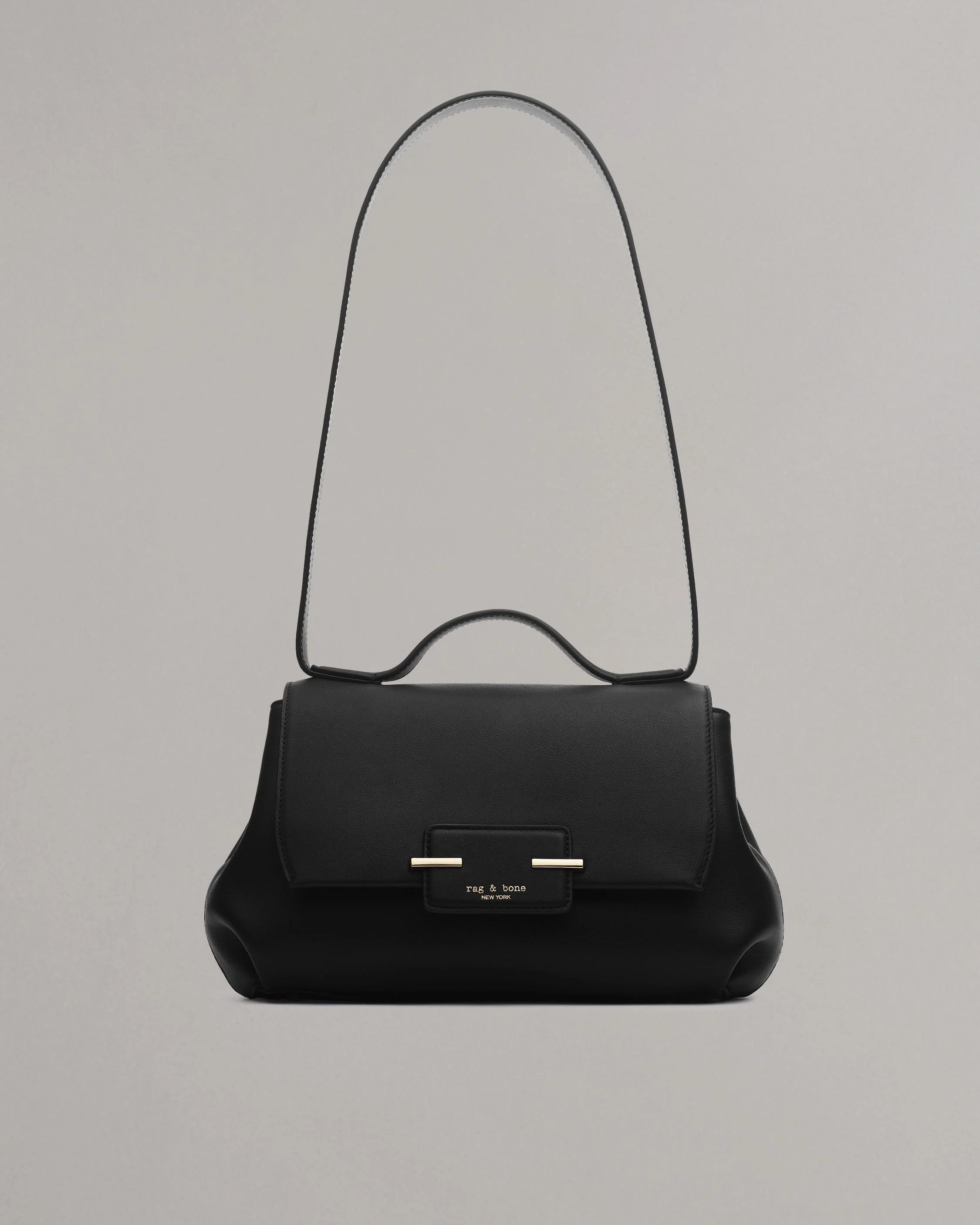 A sophisticated new flap bag designed for versatility. Crafted from smooth Italian-milled leather, this structured style is punctuated by sleek metal bars and contrast edge paint. Top handles allow you to carry it by hand or over your shoulder, while the back patch pocket offers quick access to cards. Size & Fit Height 9.4" x width 6.5" x depth 3.5" Drop length: 13.0" Features & Details 100% Cow leather Cleaning: Professional leather cleaner Fresh logo patch with sleek metal bars Magnetic lock Zipper pocket, card holder on outside of bag, top handle Dust bag included Imported. Italian materials. Product ID: LE100119