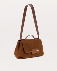 A sophisticated new flap bag designed for versatility. This structured style is crafted from soft suede and punctuated by sleek metal bars. Top handles allow you to carry it by hand or over your shoulder, while the back patch pocket offers quick access to cards. Size & Fit Height 9.4" x width 6.5" x depth 3.5" Drop length: 13.0" Features & Details 100% Cow suede Cleaning: Professional leather cleaner Fresh logo patch with sleek metal bars Magnetic lock Zipper pocket, card holder on outside of bag, top handle Dust bag included Imported. Product ID: SD100119