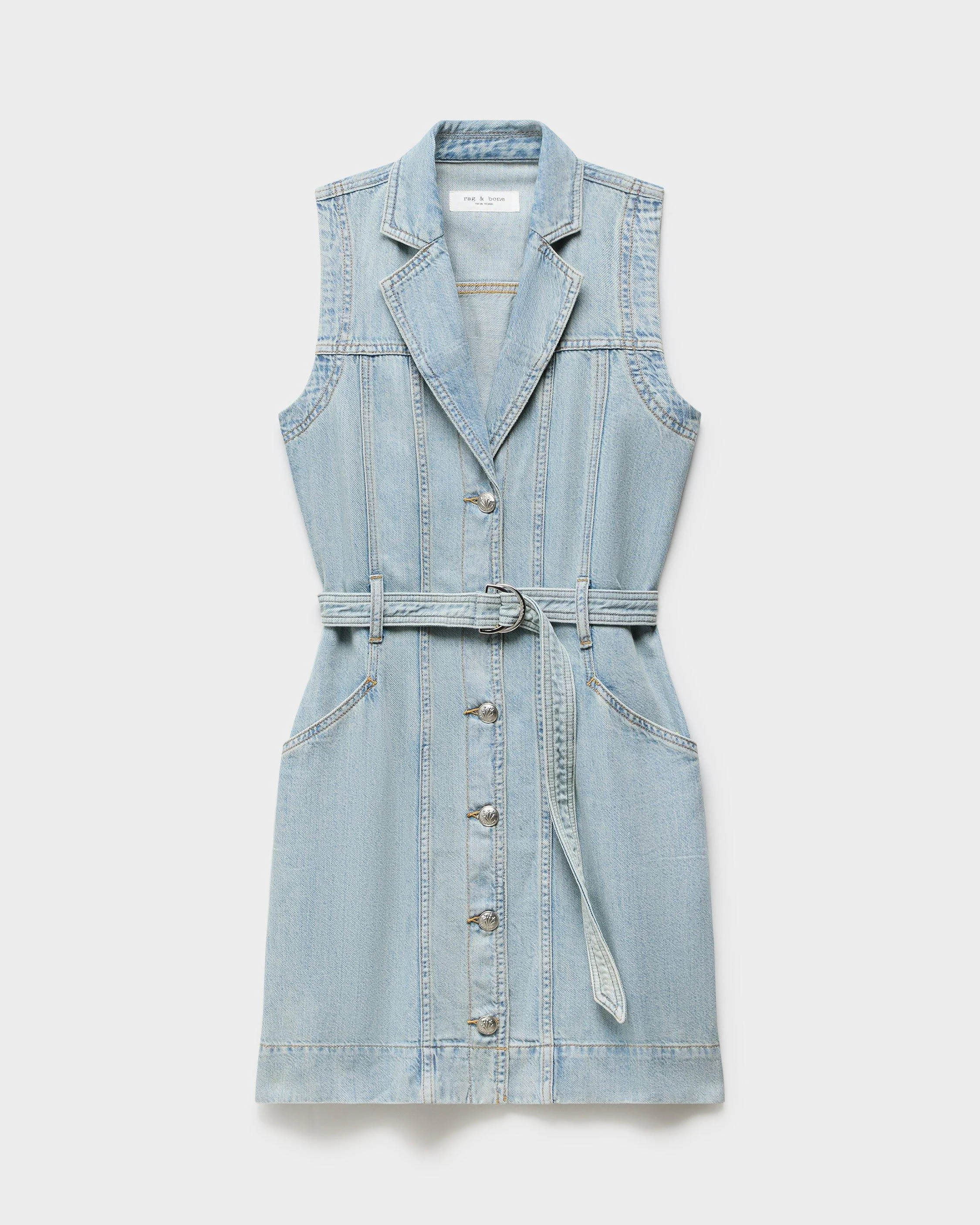 One & done. A sleeveless mini dress that makes getting dressed a breeze. Just button it up, adjust the belt, and add the right accessories for the moment. Crafted from Ultra Featherweight, the lightest version of our supremely soft and airy denim, with an effortless drape. Size & Fit • Sleevless Mini Dress • Fits true to size • Size small: 35.25" body length, 36.5" chest, 42" sweep Features & Details • 60% cotton, 40% lyocell • Machine wash cold inside out & lay flat to dry • Do not dry clean • Signature dagger button closure • Self fabric belt with branded rings • Side entry pockets • Imported Product ID: RJ0825F3UCO