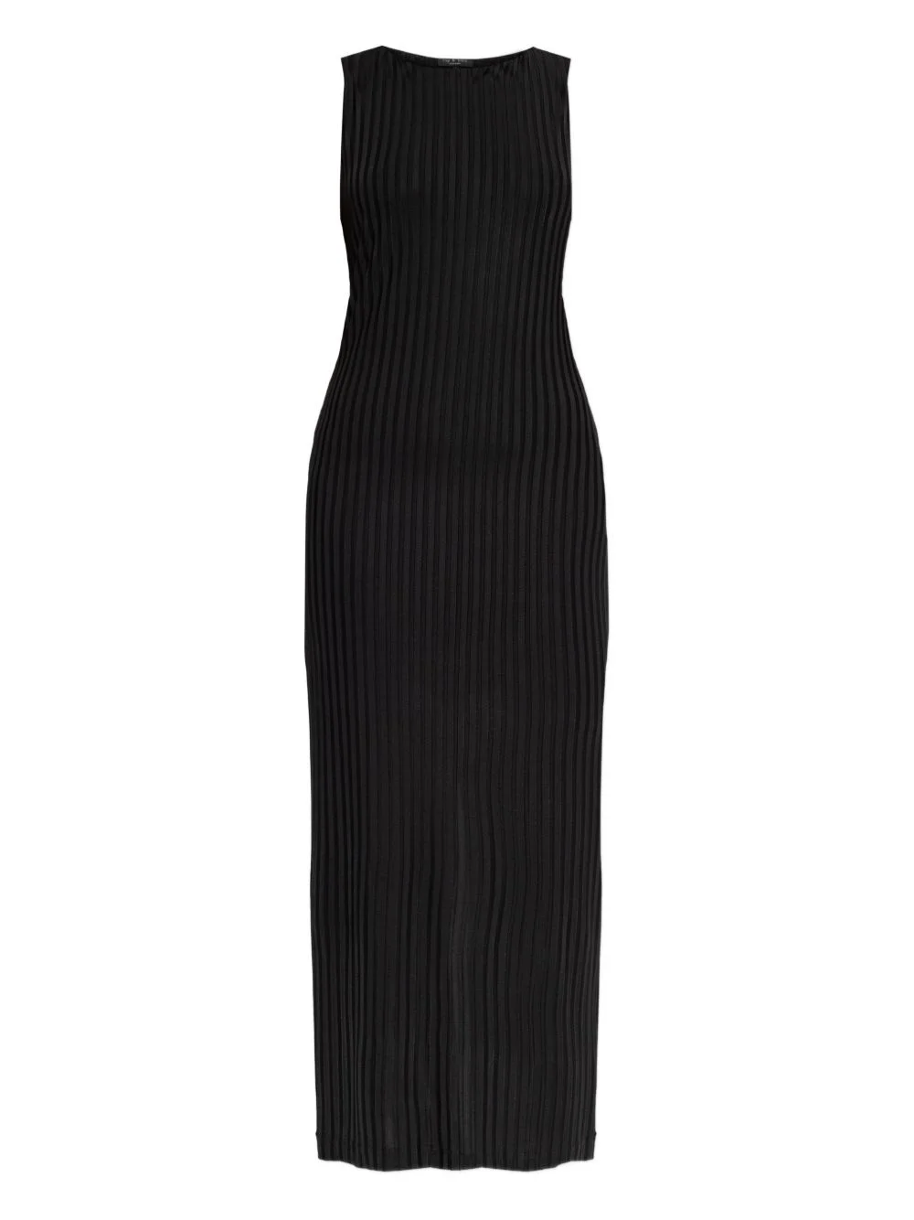 ribbed sleeveless dress Highlights - Black - Ribbed knit - Boat neck - Sleeveless - Rear slit Imported Composition Viscose 100% Washing instructions Read Manufacturer Guidelines