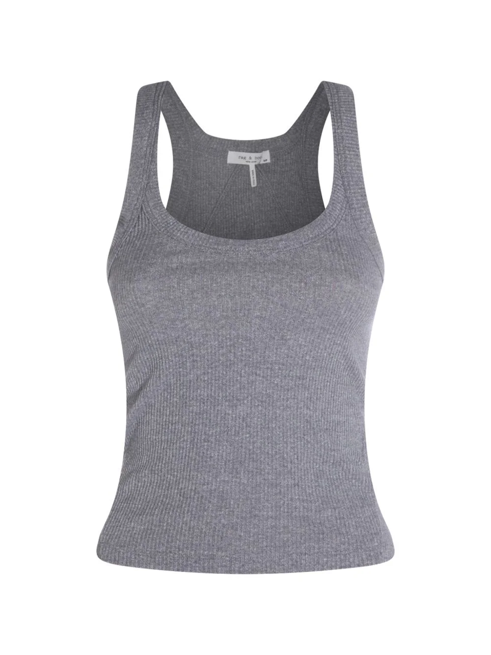 ribbed tank top Highlights - Grey - Ribbed knit - Scoop neck - Racer back - Sleeveless Made in United States Composition Cotton 48%, Polyester 48%, Lycra 4% Washing instructions Read Manufacturer Guidelines