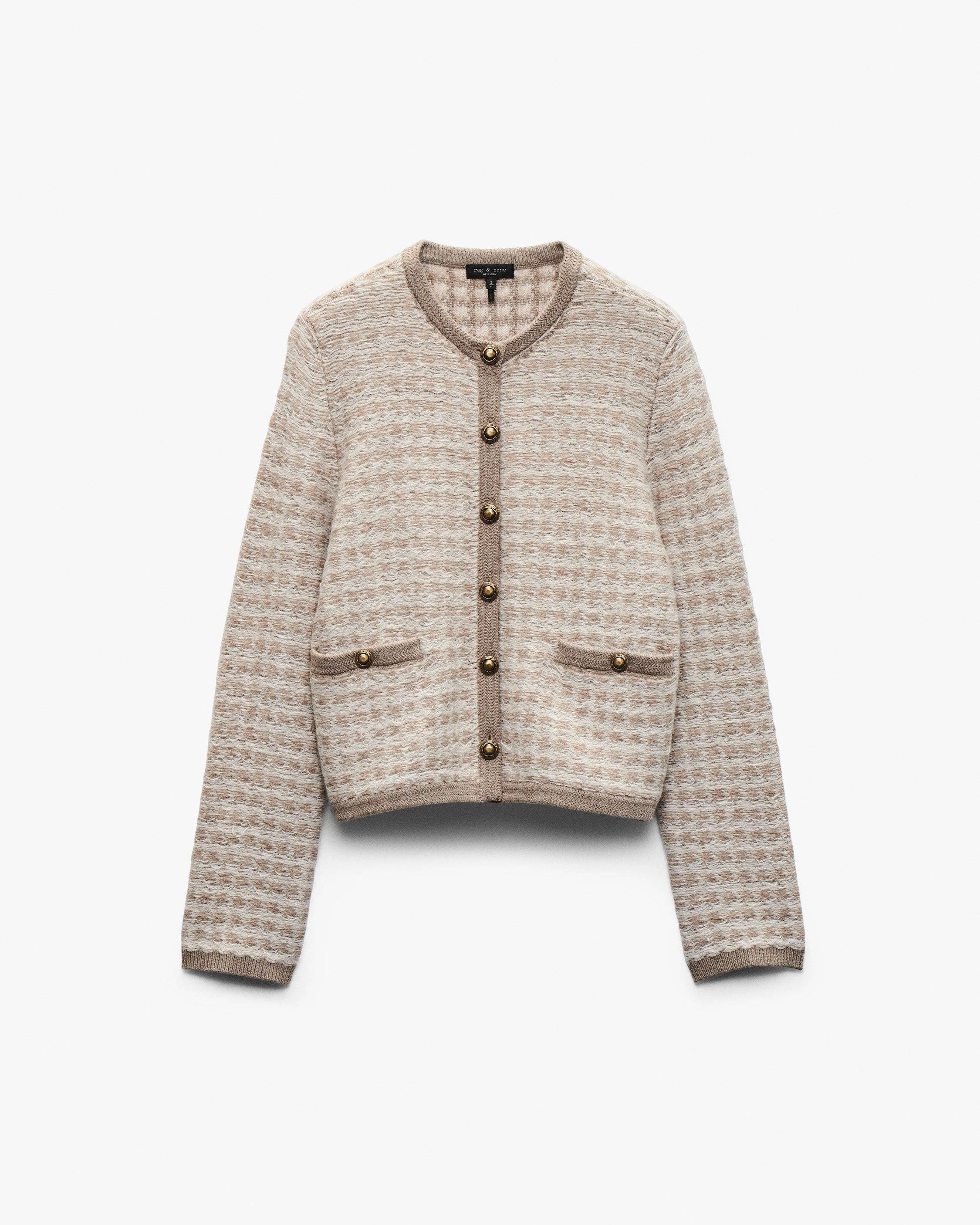 Classic with a twist. This lady cardigan’s striped tweed effect is created by blending different yarns that include fuzzy mohair and soft wool. It's finished with vintage-inspired brushed metal buttons. Wear it with tailored trousers or as a chic layer to dress up your favorite jeans. Size & Fit • Classic fit • Fits true to size • Size Small: Body length 20", chest 36", sweep 34", sleeve length 23" • Model is 5'9" wearing size small Features & Details • 48% wool, 23% polyamide, 12% viscose, 8% mohair, 7% acrylic, 2% cashmere • Hand wash cold & lay flat to dry or dry clean, delicate process • Metal buttons at center front placket and pocket openings • Welt pockets at hips • Imported Product ID: RG9725F6MWM