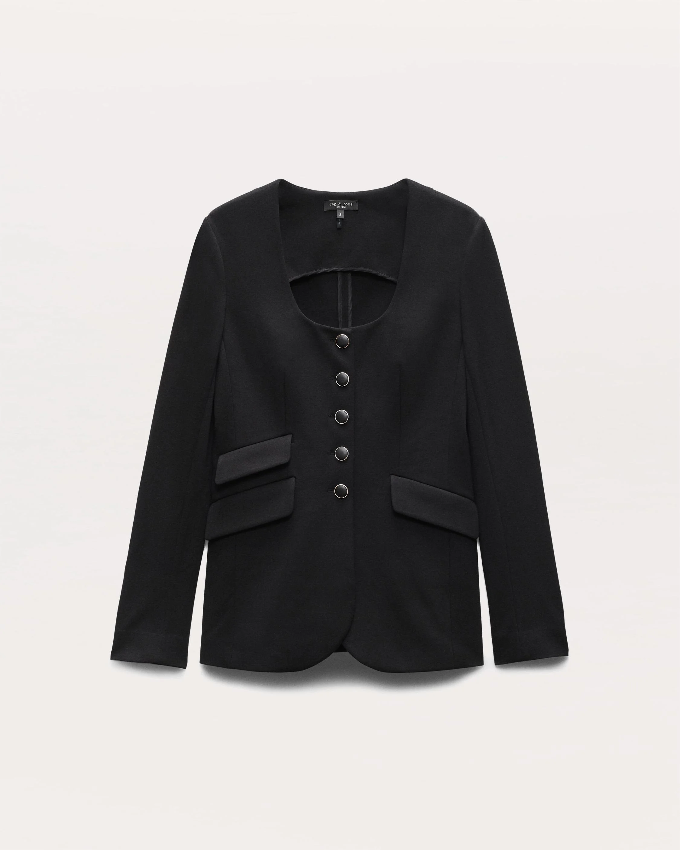 For a new take on classic tailoring, we sculpted this streamlined blazer from Ponte, our signature stretch knit that delivers structure and sophistication in all the right proportions. Metal-rimmed buttons form an elegant finishing touch. An added bonus? It's machine washable, making it an easy choice for any occasion. Size & Fit Classic blazer fit with U neck Size 4: Front length 27 1/2, back length 26", chest 33 1/2", sleeve length 31 1/2" Model is 5'10" wearing size 2 Features & Details 66% Viscose, 30% Nylon, 4% Elastane Stretch twill lining Machine wash cold, gentle cycle, do not bleach, lay flat to dry, low iron if needed or dry clean Black buttons with gold rim Front button closure Welt pockets at hips Imported Product ID: WAC25S4044D844