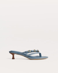 Kitten heels done our way. These sleek sandals combine the profiles of strappy mules and flip flops, all set atop a modest stacked heel. They're crafted from light-wash denim, a material core to the rag & bone DNA, and finished with signature buckles. Inside their cushioned leather footbeds, you'll find dual-density antimicrobial foam insoles: OrthoLite� Lazy-Hybrid� for custom-fit comfort, and OrthoLite� Recycled for stability and support. Size & Fit • 1.65" polished stacked leather heel Features & Details • Upper: 97% cotton, 3% polyurethane • Outsole: 100% leather • Lining: 100% sheep leather • Slip-on closure • Straps detailed with signature buckle trio • Ortholite footbed wrapped in sheep leather • Leather outsole • Ortholite: Recycled sock foam • Dust bag included • Based on the delicate nature of the materials, please handle with care • Imported Product ID: WFF25PF1018CO18