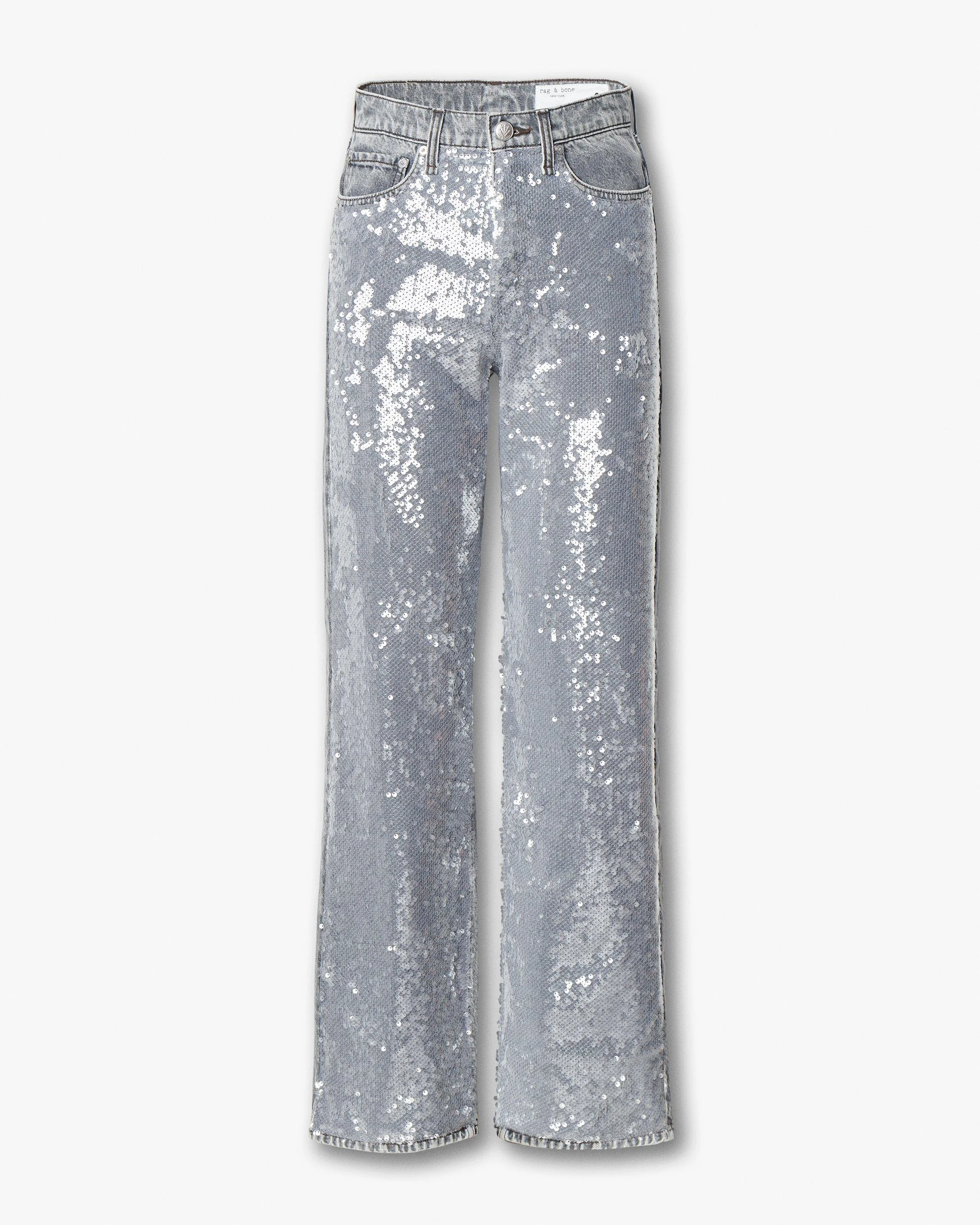 The Shea. High-rise jeans with a fitted waist and a straight leg that falls past the ankle. Crafted from Lightweight Rigid non-stretch denim that provides structure, but breaks in over time for a soft and comfortable feel. In Steele Sequins, a light-medium grey wash with tonal sequins down the front for a festive, holiday look. Size & Fit • Fits true to size • Size 26: 11.75" rise, 32" inseam, 18" leg opening • Model is 5'9" wearing size 24 Features & Details • 100% cotton • Lightweight Rigid Denim in Steele Sequins, a light-medium grey wash with tonal sequins down the front for a festive, holiday look • Zip fly with a button closure • Signature dagger button & rivets • Branded paper patch • Five-pocket silhouette • Hand wash • Imported Product ID: RJ3925H1RSS