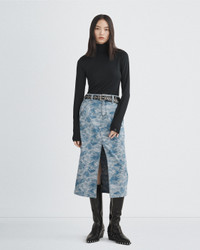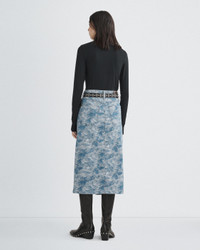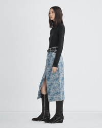 The Sid. A sharp midi skirt in statement jacquard. Crafted in 100% cotton and cut for a high-rise fit, with our signature metal dagger button closure. Size & Fit High-rise midi skirt Size 26: Front Length 32 1/2", Sweep 43 1/4" Model is 5'9.5" wearing a size 25 Features & Details 100% Cotton Machine wash cold inside out with like colors. Do not use bleach. Hang to dry. Use warm iron if necessary. Color transfer may occur Hanging nickel dagger front closure with back patch Clean hem Five- pocket silhoutte Imported Product ID: WDD23F2955JQDJ