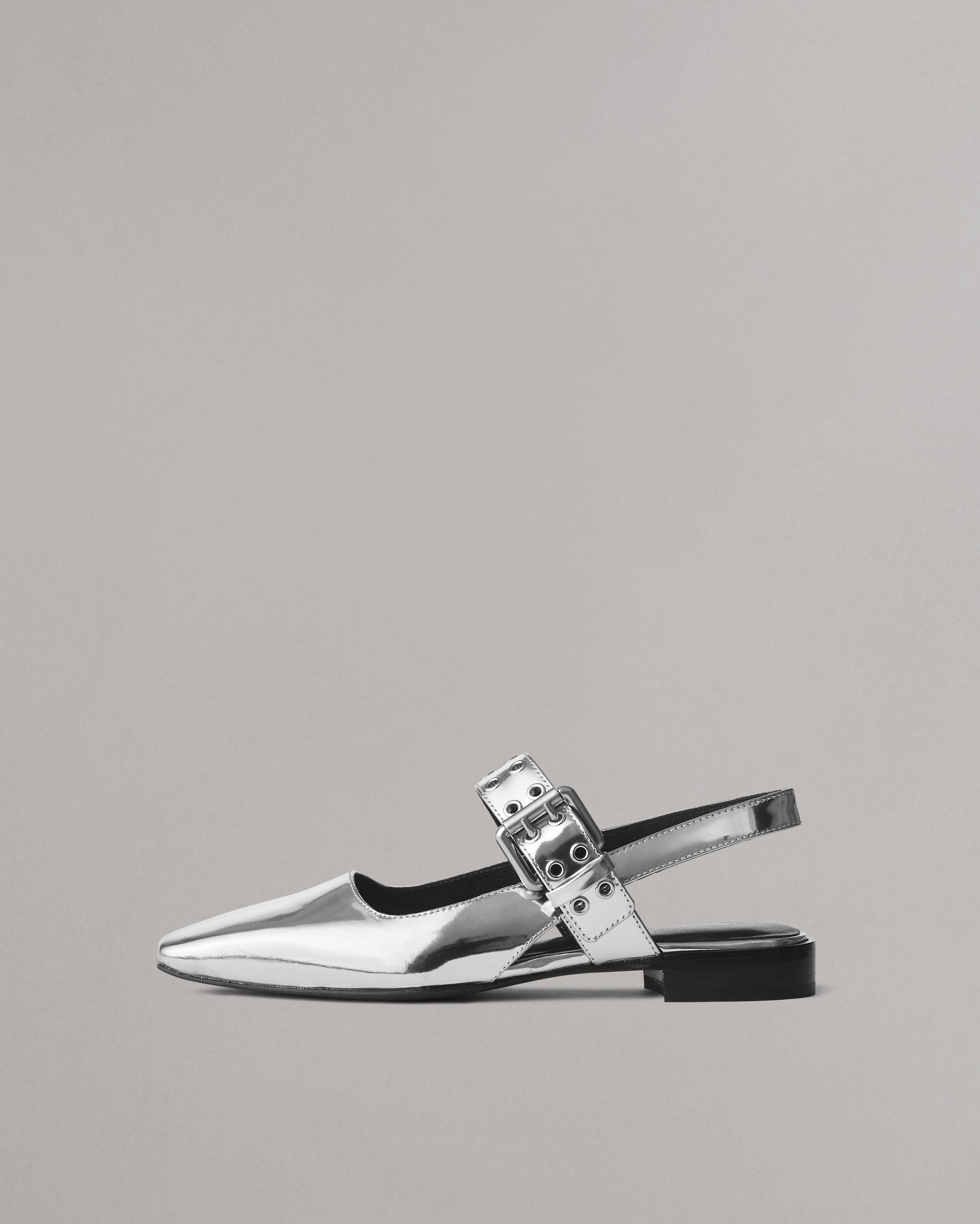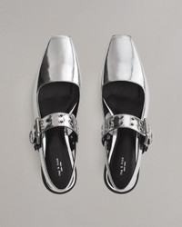 A rag & bone favorite in a new context. This flat style retains its quintessential tapered square toe, but is secured with a slingback and a grommet-studded Mary Jane strap, all in glossy metallic leather. Crafted with dual-density antimicrobial foam insoles: OrthoLite Lazy-Hybrid for custom-fit comfort, and OrthoLite Recycled for stability and support. Size & Fit 0.7" Polished stacked leather heel Features & Details Upper: 100% Cow Leather Lining: 100% Goat Leather Professional leather cleaner Slingback Tapered Square Toe Metallic leather Strap with custom double prong buckle & metal eyelets Hidden gore for ease of entry & comfort Leather outsole Imported Product ID: WFF24SF002TL2