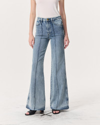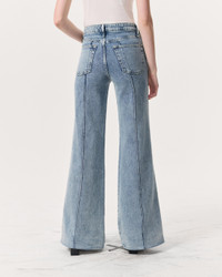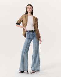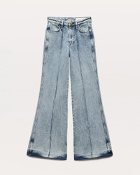 The Skylar. Our new high-rise flare jeans with roomy legs that gradually open into super-wide, flared hems. Distinctive details like pin-tuck seams down the front and a braid-embossed metal button further set them apart. Crafted from our Vintage Stretch denim for a timeworn look with added comfort. In Clementine, a light indigo with a slight acid wash. Size & Fit High-rise wide leg trouser, full length Size 26: 11 1/4" front rise, 33" inseam, 26 1/2" leg opening Model is 5'10.5 wearing size 25 Features & Details 99% Cotton, 1% Elastane Vintage Stretch Denim in Clementine, a light indigo with a slight acid wash. Machine wash cold inside out with like colors, gentle cycle, do not use bleach, hang to dry, low iron if need, color may transfer. Zip fly with signature braided button closure and metal rivets Five-pocket silhouette Imported Product ID: WDD25S3008VSCL