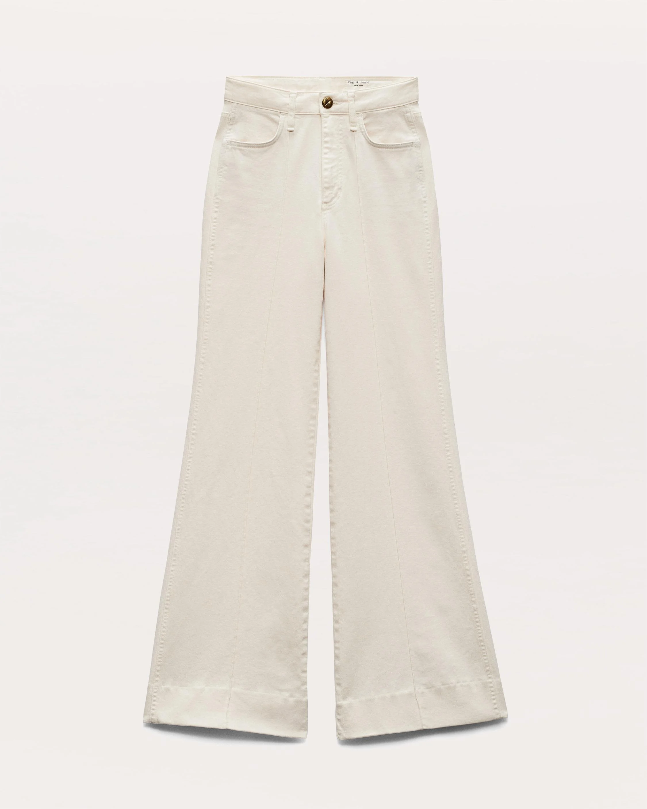 The Skylar. Our new high-rise flare jeans with roomy legs that gradually open into super-wide, flared hems. Distinctive details like pin-tuck seams down the front and a braid-embossed metal button further set them apart. Crafted from our Vintage Stretch denim for a timeworn look with added comfort. In Ecru, a pale cream hue. Size & Fit High-rise wide leg trouser, full length Size 26: 11 1/4" front rise, 33" inseam, 26 1/2" leg opening Model is 5'10.5 wearing size 25 Features & Details 98% Cotton, 2% Elastane Vintage Stretch Denim in Ecru, a pale cream hue. Machine wash cold inside out with like colors, gentle cycle, do not use bleach, hang to dry, low iron if need, color may transfer. Zip fly with signature braided button closure and metal rivets Five-pocket silhouette Imported Product ID: WDD25S3008VSEC