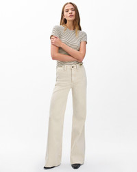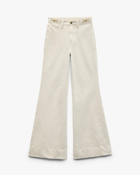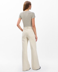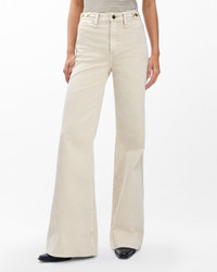 The Skylar. Standout trouser-style jeans with a high rise and roomy legs that gradually open into super-wide, flared hems. Signature metal horsebit accents at the waist further dial up its distinction. Crafted from our Vintage Stretch denim for a broken-in look & feel with a comfortable touch of stretch. In Sandstone, a muted light beige wash. Size & Fit • High-rise trouser • Full-length • Fits true to size • Size small: 11.25" front rise, 34" inseam, 26.5" leg opening • Model is 5'10" wearing size 24 Features & Details • 91% cotton, 8% polyester, 1% elastane • Vintage Stretch Denim in Sandstone, a muted beige wash • Machine wash cold inside out on delicate & lay flat to dry • Color may bleed • rag & bone branded button and metal bit trim at waistband • Zip fly with button closure • Coin pocket & back patch pockets • Imported Product ID: RJ2325F1VSS