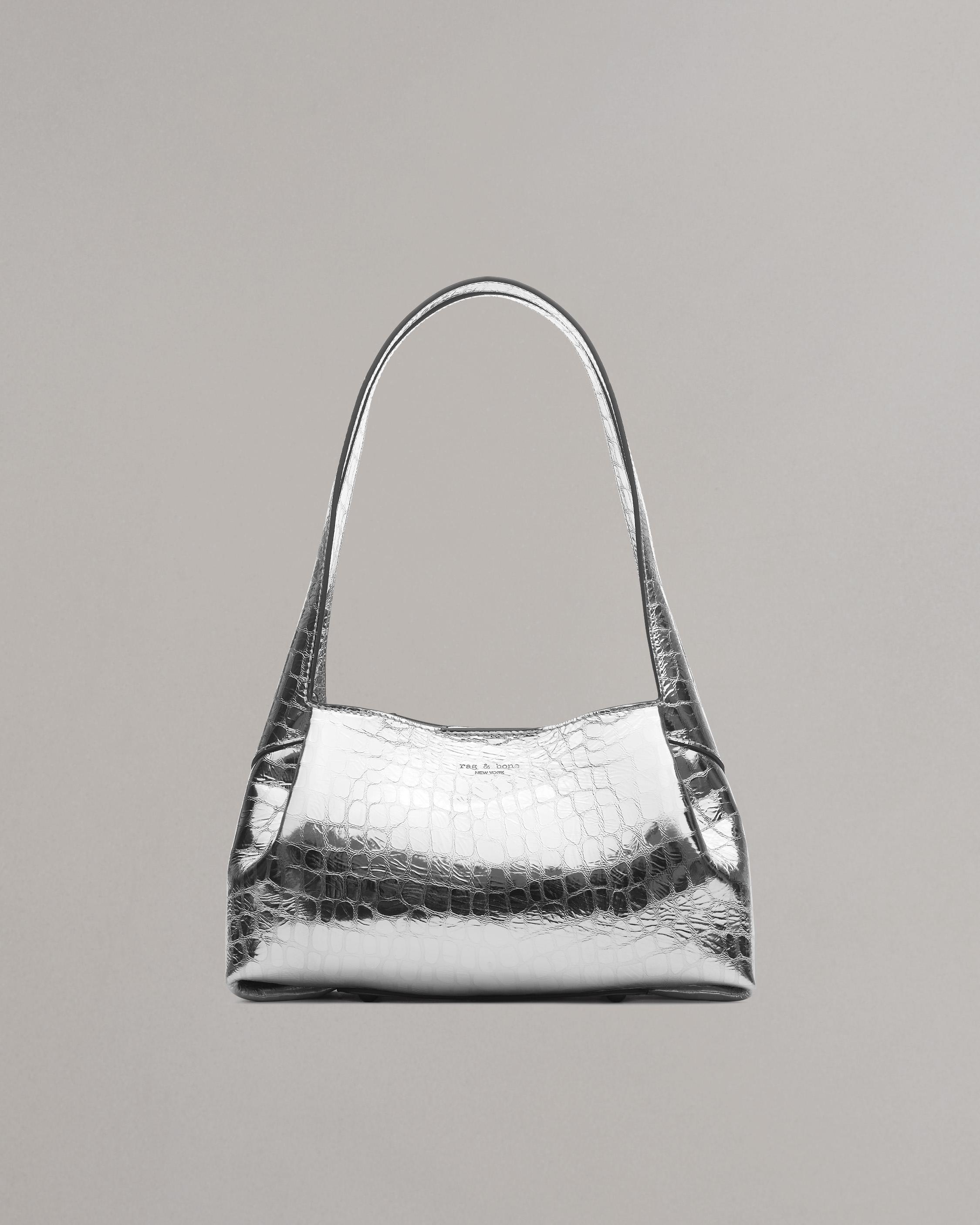 A functional spin on downtown nonchalance. Crafted from metallic, crocodile-embossed leather milled in Italy, this shoulder bag features a luxe, unlined interior with a center zipped divider and concealed magnetic closure to keep your items organized and secure while on the go. Carry it comfortably by hand or slung over your arm. Size & Fit Height 10.2" x width 5.3" x depth 4.7" Drop length: 8.3" Features & Details 100% Cow metallic leather Cleaning: Professional leather cleaner Center divider, magnet closure, metal feet at the base Magnetic lock Unlined, two large sections separated by leather divider Dust bag included Imported. Italian materials. Product ID: ME101108
