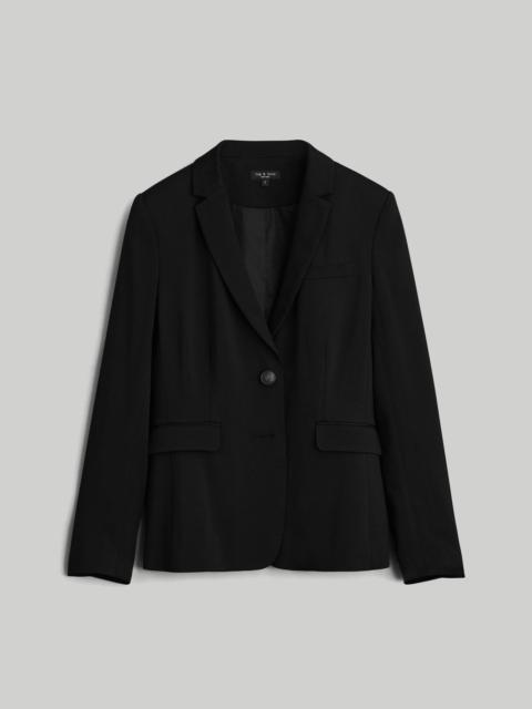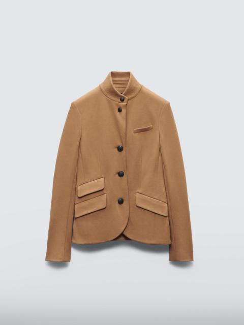 Featuring a stand collar, this lightweight blazer is crafted in soft ponte fabric. This style perfectly blends the refinement of a blazer with the utility of a military jacket. Size & Fit Fits true to size, hits at the hip Size 4: Front length 25 1/2", back length from center back neck 24 1/2", chest 35", sleeve length 32 1/2" Model is 5'9.5" wearing a size 2 Features & Details 68% Viscose 28% Nylon 4% Elastane Dry clean only Signature dagger buttons at center front and sleeve opening, unlined Imported Product ID: WAW23S4026A926