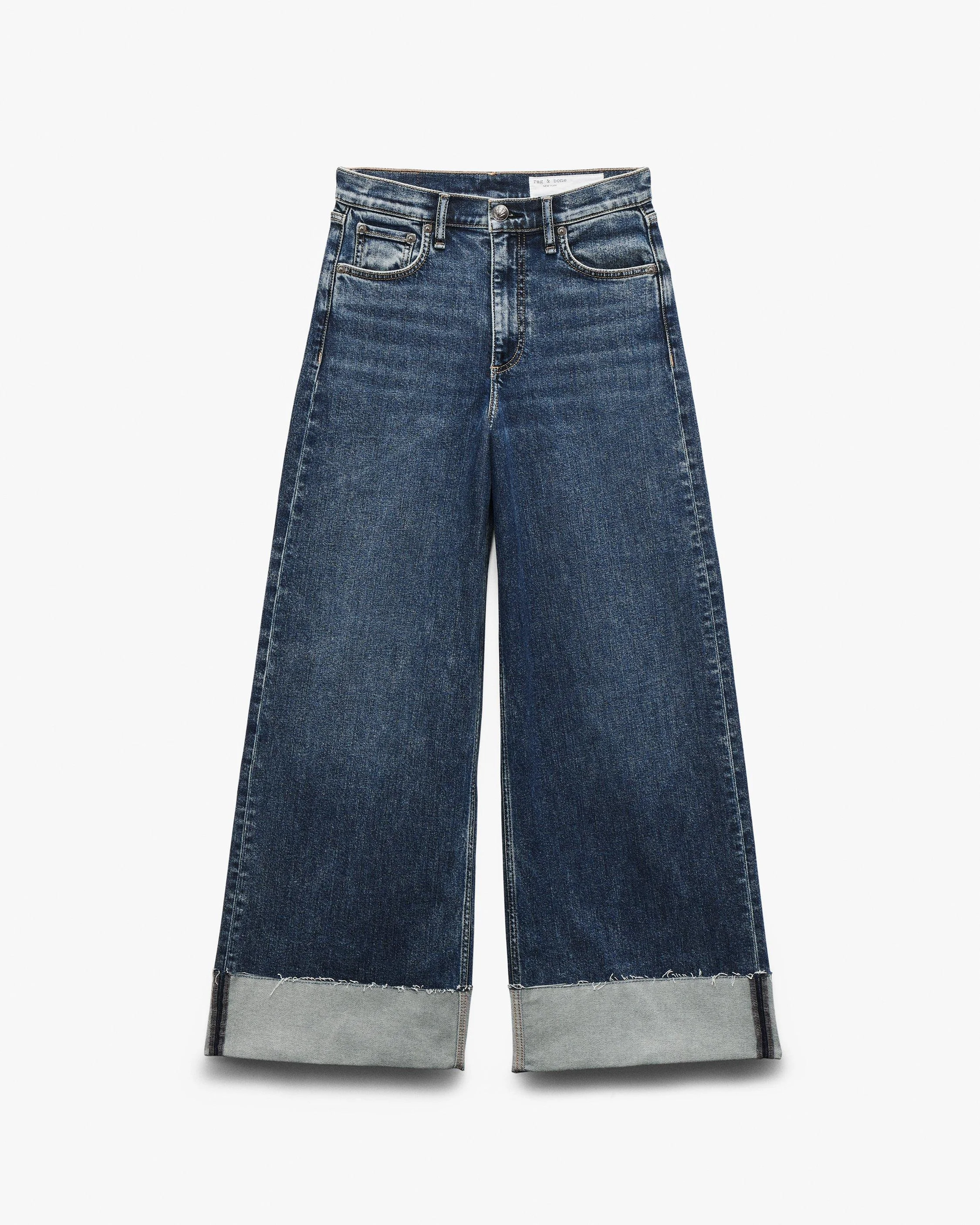 The Sofie. High-rise jeans with super-wide, full legs that are rag & bone office favorites. Crafted from our Vintage Stretch denim for a broken-in look & feel with a comfortable touch of stretch. In Lee, a dark indigo wash that's finished with folded and tacked cuffs. Size & Fit • High rise • Wide leg, full-length • Fits true to size • Size 26: 11.75" rise, 29" inseam (after 4" cuff), 25.25" leg opening • Model is 5'9" wearing size 24 Features & Details • 69% cotton, 18% lyocell, 11% viscose, 2% spandex • Vintage Stretch Denim in Lee, a dark indigo wash that�s finished with folded and tacked cuffs • Machine wash cold inside out on delicate & lay flat to dry • Color may bleed • Signature dagger buttons & branded washer rivets • Zip fly with button closure • Five-pocket silhouette • Imported Product ID: RJ2625F1SLE