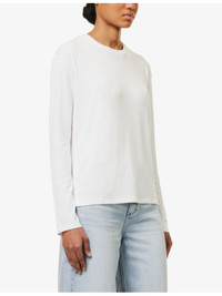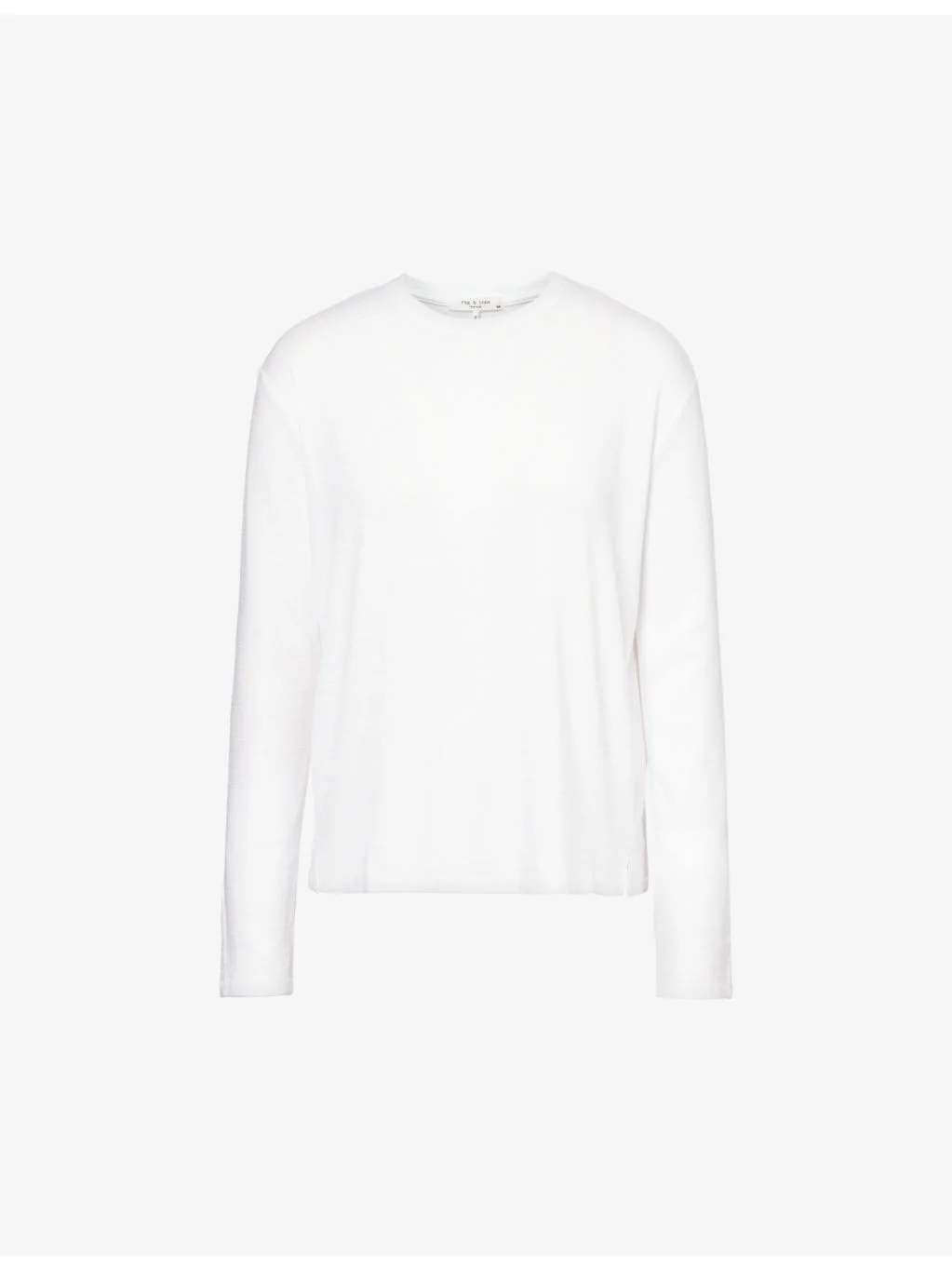 PRODUCT DETAILS - rag & bone woven top - 48% polyester, 48% rayon, 4% elastane - Slips on - Relaxed fit, round neckline, long sleeves, split at hem sides, semi-sheer - Machine wash cold - True to size - Size small: length 24in / 61.5cm - Model is 5ft 10in/1.78m and wears a size small - Lightweight, slight stretch Ref: R04299772