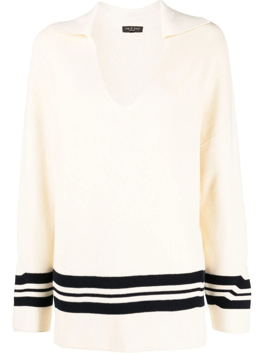 stripe-trim oversized jumper ivory white/black cotton blend stripe trim V-neck spread collar long sleeves straight hem Imported Composition Cotton 85%, Nylon 13%, Spandex/Elastane 2% SIZE & FIT Model measurements Height 5 ft 10 in(1.77 m) Bust/Chest 32.28 in(82 cm) Hips 35.03 in(89 cm) Waist 25.19 in(64 cm) FittingInformation This piece fits true to size. We recommend you get your regular size Cut for a loose fit Made with a mid-weight stretch fabric Washing instructions Dry Clean Only