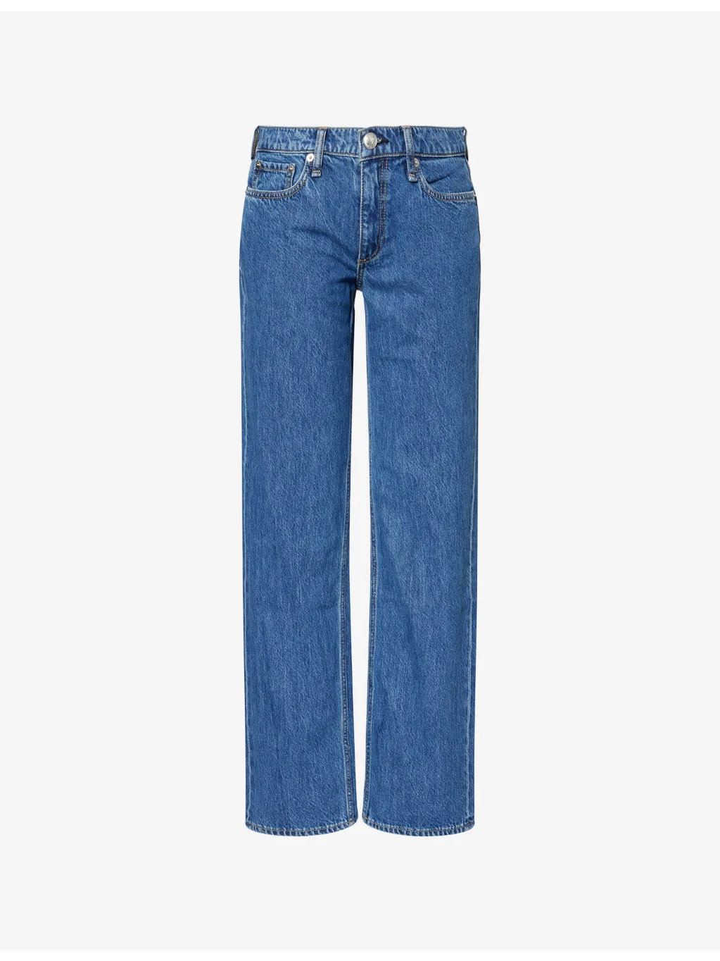 PRODUCT DETAILS - rag & bone denim jeans - 100% cotton; embellishments 100% cow leather - Exposed button and concealed zip-fly fastening at front - Regular fit, low-rise, straight leg, belt loops, five pockets, brand patch at back - Machine wash at 30°C - True to size - Size 26: rise 12in / 32cm, inside leg 31in / 79cm, leg opening 14in / 36cm - Model is 5ft 10in/1.78m and wears a size 26 - Lightweight, slight stretch Ref: R04590961
