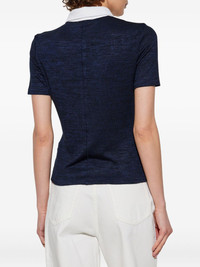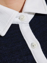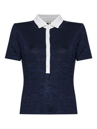 two-tone polo top Highlights - Navy blue - Short front button fastening - Polo collar - Shoulder pads - Short sleeves Imported Composition Polyester 48%, Viscose 48%, Spandex/Elastane 4%